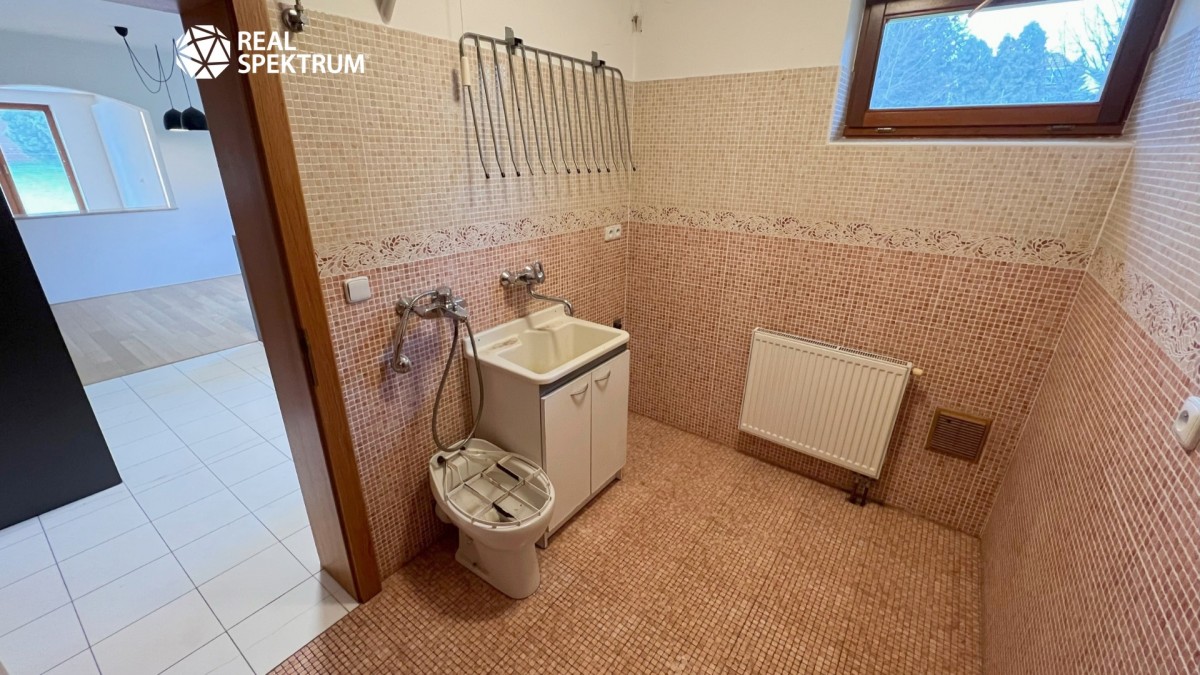V přízemí se nachází prostorný obývací pokoj, krásná moderní kuchyně (spotřebiče Miele s vinotékou), chodba s úložným prostorem, koupelna, prádelna a dvojgaráž.