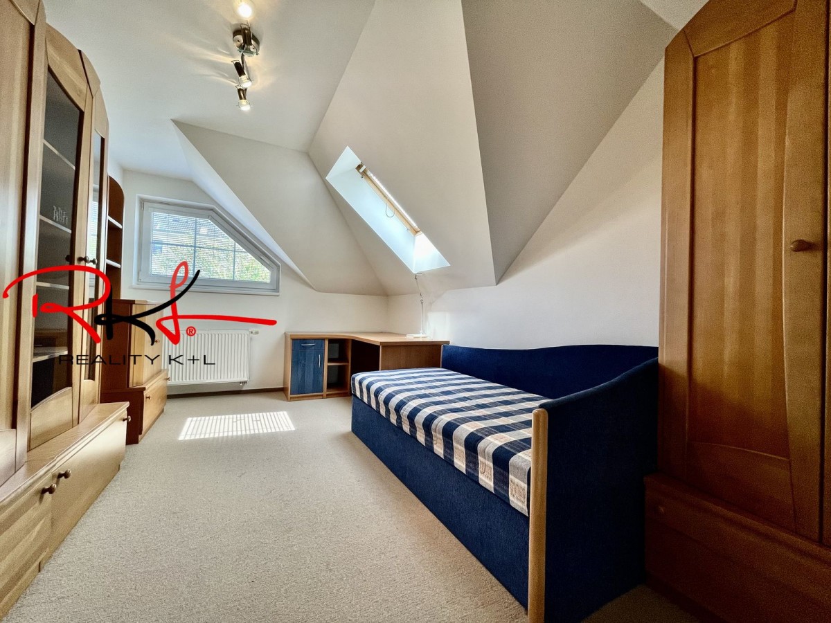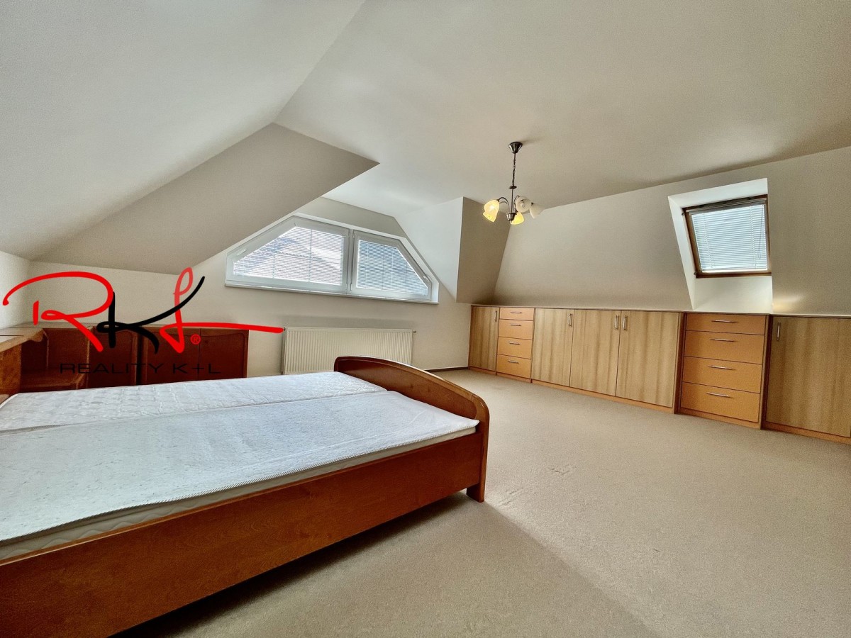 Patro: po schodech se dostanete do patra, který tvoří 4 samostatné ložnice a koupelnu s vanou, sociální zařízení WC, šatna. Vytápění domu a ohřev vody je řešeno plynovým kotlem + je možnost topit krbovými kamny v zimních měsících. Garážové stání. Zabezpečení domu alarmem. Nemovitost disponuje závlahovým systémem.