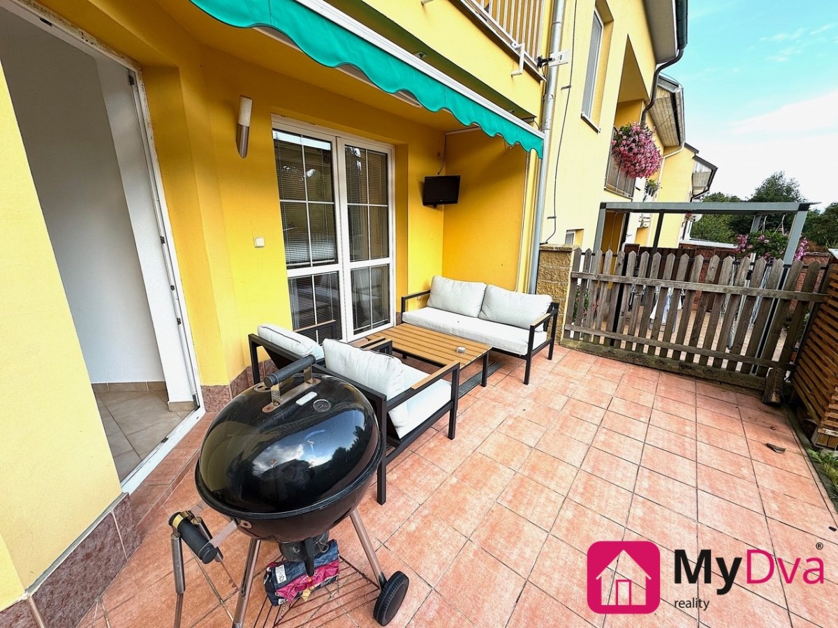 Za domem najdete udržovanou zahradu o ploše 124 m² s terasou, markýzou a zahradním domkem na nářadí – ideální prostor pro relax i rodinné grilování. Před domem jsou dvě parkovací stání. Dům se pronajímá bez garáže.