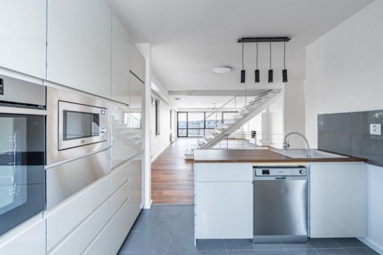 V přízemí je situován oddělený byt disponující obývacím pokojem, dvěmi ložnicemi, dvěmi vchody na zahradu, koupelnou, sociální zařízení WC, komorou a kotelnou. V prvním patře se nachází obývací pokoj s novou podlahou, krbem a vstupem na krytou terasu, jídelna, kuchyň, pracovní místnost, sociální zařízení WC a balkon. Zcela nová kuchyňská linka je vybavena myčkou Sharp, vestavnými spotřebiči - lednicí, troubou Gorenje, mikrovlnkou Beko a indukční varnou deskou Gorenje s digestoří. V pracovní místnosti je k dispozici dostatek úložného prostoru a pračka značky Samsung. Druhé patro disponuje třemi ložnicemi se dvěmi balkony, koupelnou s vanou, sprchovacím koutem a dvěmi umyvadly a sociální zařízení WC. Třetí patro v podkroví s klimatizací nabízí dispozice velkého ateliéru pracovny s velkou střešní terasou s nádherným otevřeným výhledem na Prahu, koupelnou se sprchovacím koutem, umyvadlem, sociální zařízení WC a saunou.