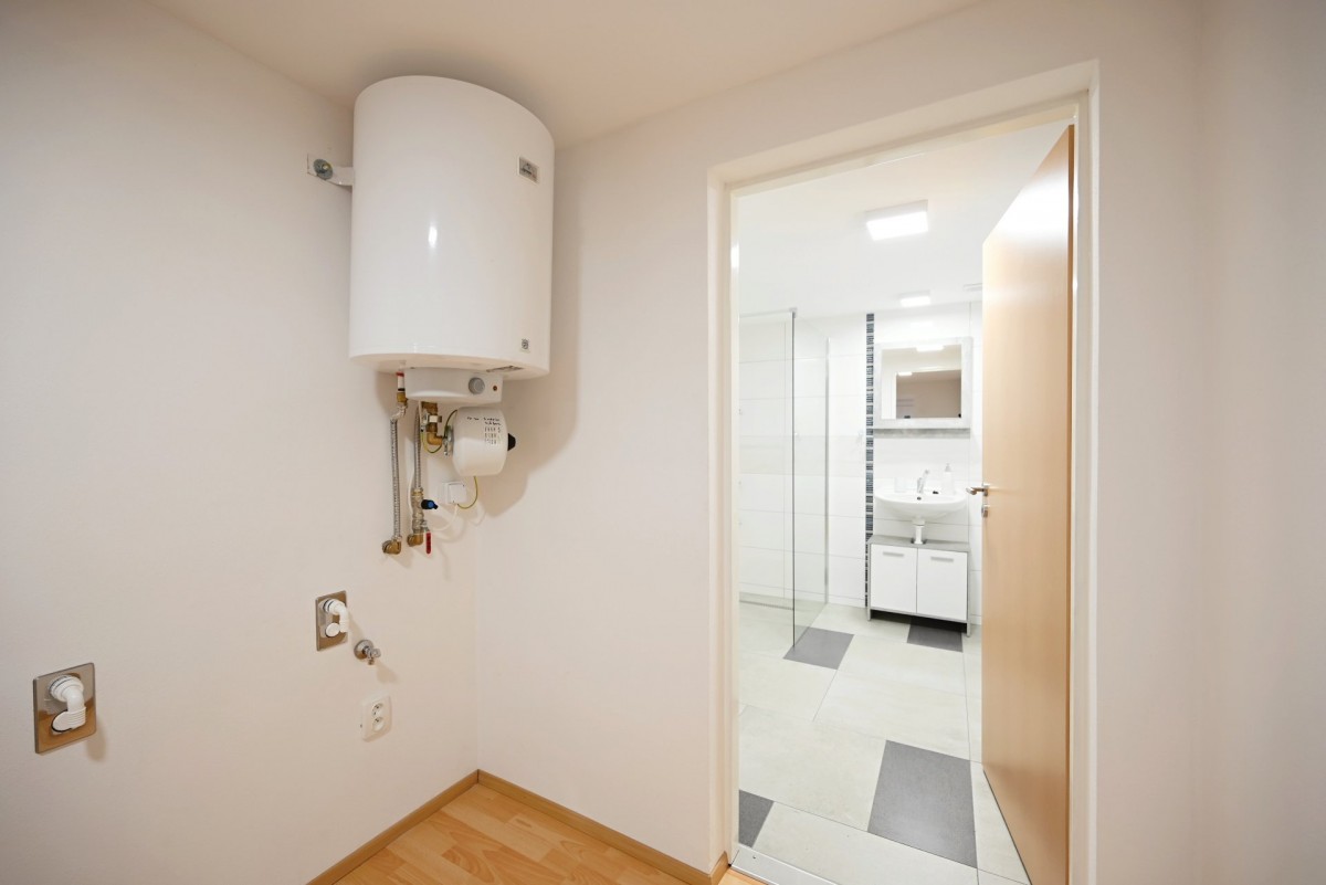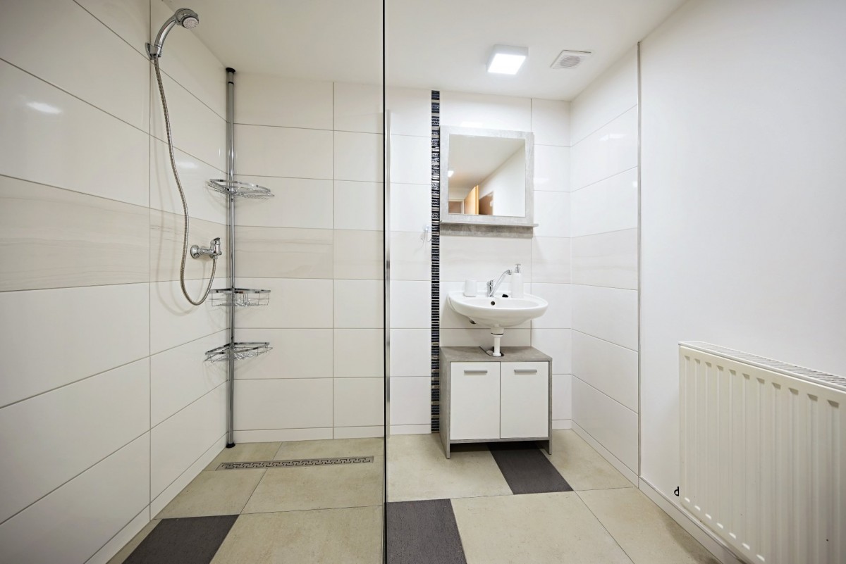 Koupelna se sprchovým koutem, umývadlem, společná s sociální zařízení WC. Vývod na pračku a sušičku nachystán v chodbě.
