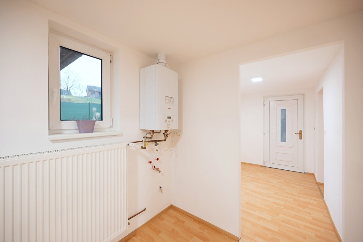 Vytápění novým plynovým kotlem, nové rozvody v mědi a topná tělesa. Ohřev TUV elektrickým bojlerem.