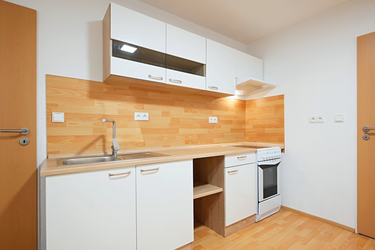 Kuchyňská linka nová na míru, elektrický sporák zabudovaný, digestoř, lednice s mrazákem volně.