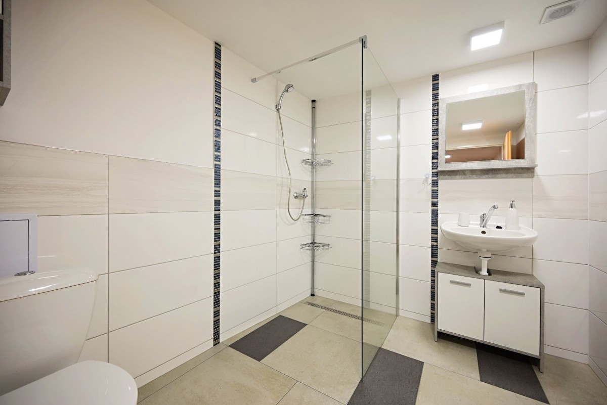 Podlaha nová plovoucí, v koupelně keramická dlažba.