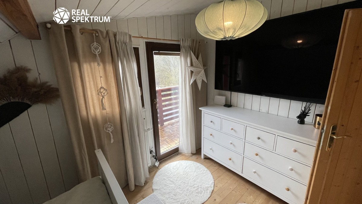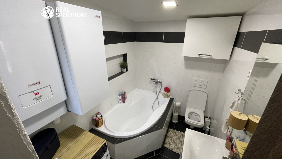 V přízemí domu se nachází moderní koupelna s vanou a prostorný, otevřený koncept kuchyně s obývacím pokojem. Celý prostor je velice světlý, vzdušný a působí útulným dojmem. V patře jsou situovány dva samostatné pokoje a balkon, ze kterého si můžete vychutnat moc hezké výhledy do krajiny.