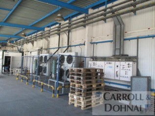 Přízemní hala rozměry 18 x 24 m se zastřešenou rampou 108m2 . Nosná konstrukce je železobetonová. opláštění sendvičový PUR panel tloušťka 17 cm odpovídá tepelněizolačním podmínkám mrazírny. Instalováno průmys...lové chlazení , skladovací teplota do +2 st. C . Hladké betonové podlahy , stěny , stropy hygienicky udržovatelné a omývatelné, vše splňující podmínky pro veterinárně sledované zboží. Do haly 1 krát vjezdová vrata, u rampy instalována vyrovnávací plošina pro menší vozidla. Přímo na rampě k dispozici kanceláře 10m2 , v patře budovy dalších 400m2. venkovní zpevněná plocha 360 m2. Instalováno osvětlení , el. rozvody dostatečné dimenze. Veškeré energie samostatně měřené.