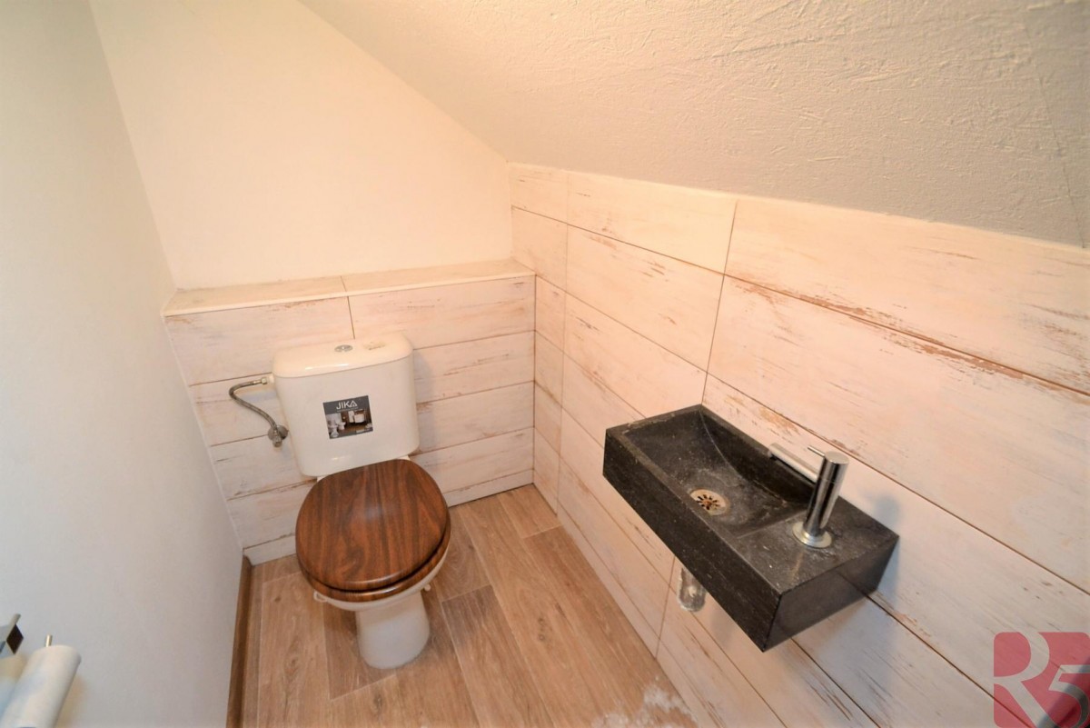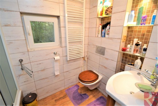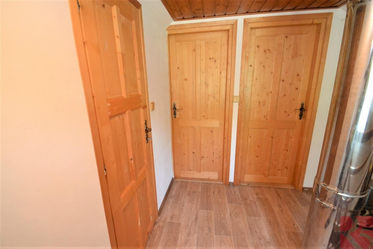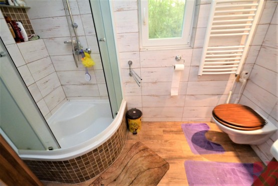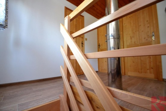 V přízemí chaty je vstup s hlavní koupelnou, najdete zde sprchový kout, první toaletu a umyvadlo. Projdete ke schodišti do prvního patra a do obývacího pokoje s kk. Z obývacího pokoje je vstup na terasu s přesahem prvního patra. Po hezkých dřevěných schodech dojdete ke dvou samostatným pokojům a druhé toaletě s umyvadlem a místem pro pračku.