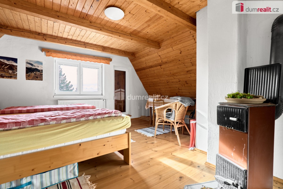 prodej rekonstruované zateplené chalupy v Krušných horách, v těsné blízkosti obce Nové Hamry v nádherné lokalitě s výhledem do údolí na pozemku o celkové velikosti 1. 942 m². Chalupa stojí na konci příjezdové cesty a je na ...polosamotě obklopena lesy a přírodou. V přízemí objektu je obývací pokoj s kuchyňským koutem a krbovými kamny, koupelna s sociální zařízení WC a technická místnost, ve které je umístěn plynový kotel, kterým je dům vytápěn. V podkroví jsou dva samostatné pokoje, z nichž jeden má vstup na balkon. V chodbě podkroví je vestavěná skříň. Objekt je napojen na el. energii (rozvody v mědi) a plyn. Vodu zajišťuje vlastní vrt a odpad je sveden do septiku s trativodem. V okolí jsou lesy s mnoha turistickými, cyklistickými a běžeckými trasami a lyžařskými středisky. Dům je vhodný i pro trvalé bydlení. Cena zahrnuje i veškeré vnitřní vybavení (viz foto). Tuto nemovitost lze hradit hypotečním úvěrem, který Vám rádi pomůžeme vyřídit v našem hypotečním centru. Ev. číslo: 653094. Energetický štítek: G