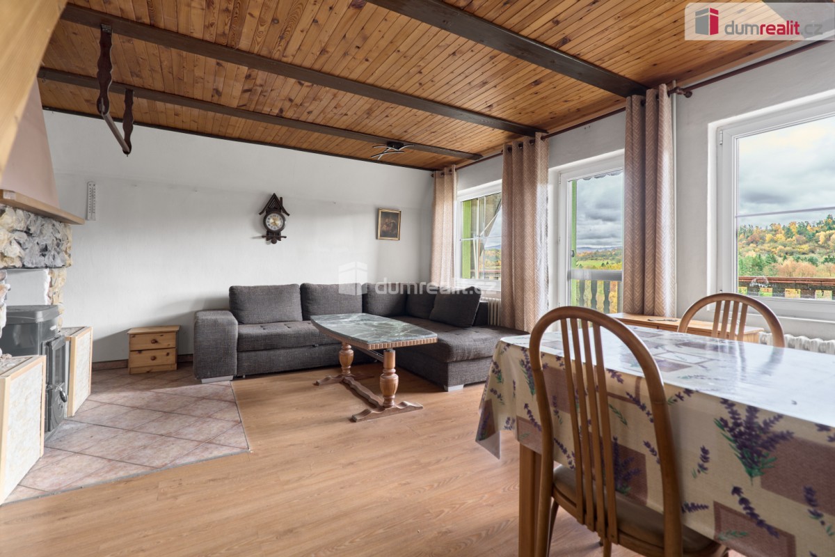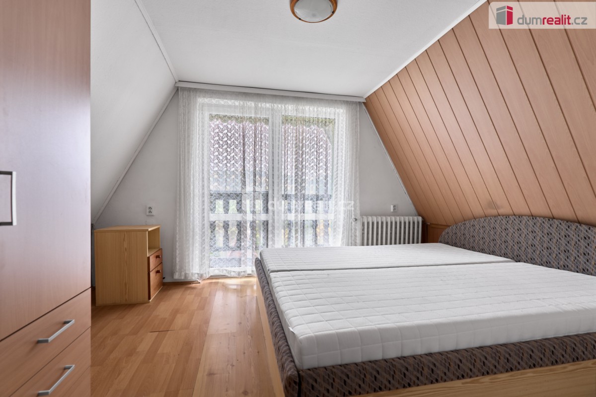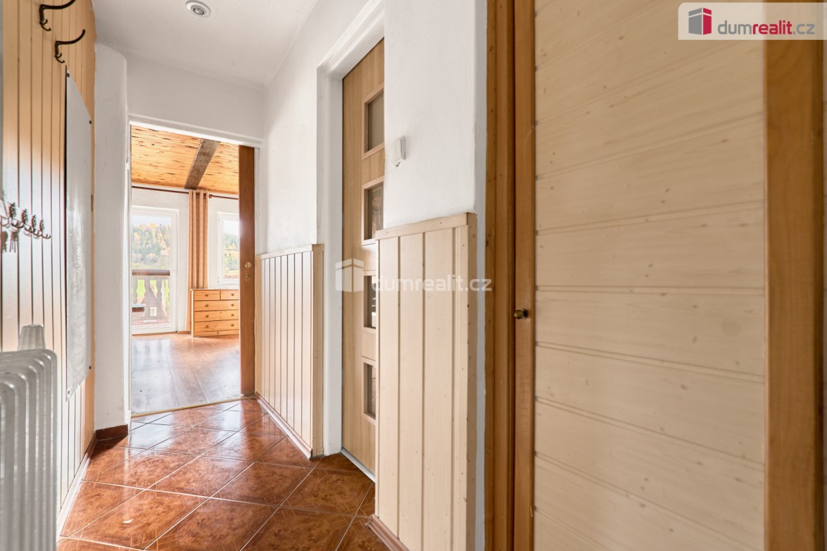 V přízemí chaty se nachází zádveří, vstupní chodba, obývací pokoj s krbovými kamny a vstupem na balkon, kuchyně s kuchyňskou linkou na míru, koupelna se sprchovým koutem a sociální zařízení WC, a samozřejmě schodiště. V podkroví se pak nacházejí dva samostatné pokoje a prostorná půda pro uskladnění věcí. Ve sklepě najdete společenskou místnost, dílničku a technickou místnost. Vytápění domu je zajištěno tepelným čerpadlem (3roky) a ohřev vody je zajištěn el. bojlerem (3roky).