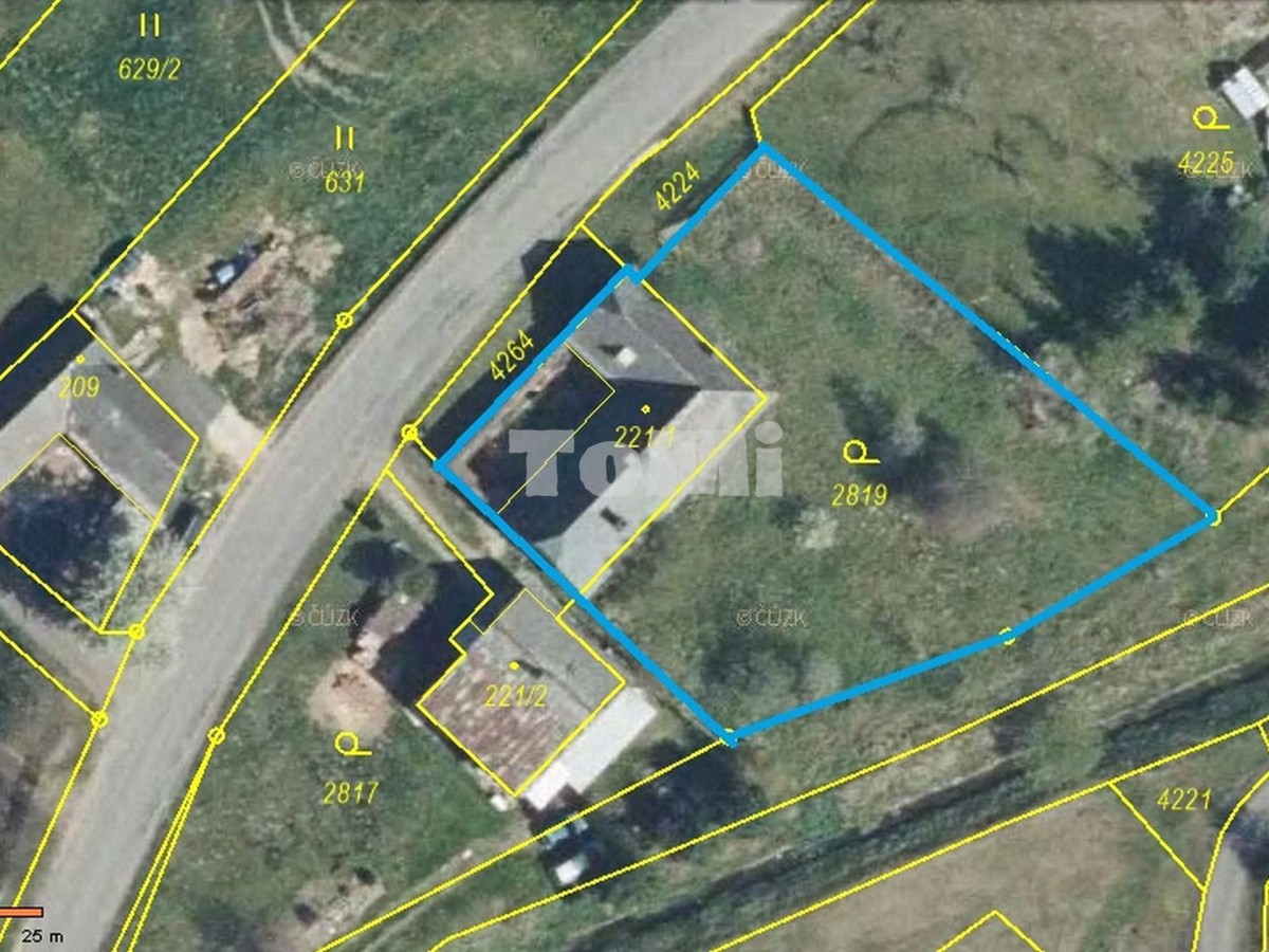Zatravněná zahrada o výměře 1063 m2 se mírně svažuje k potoku a je částečně oplocená.