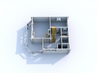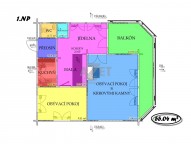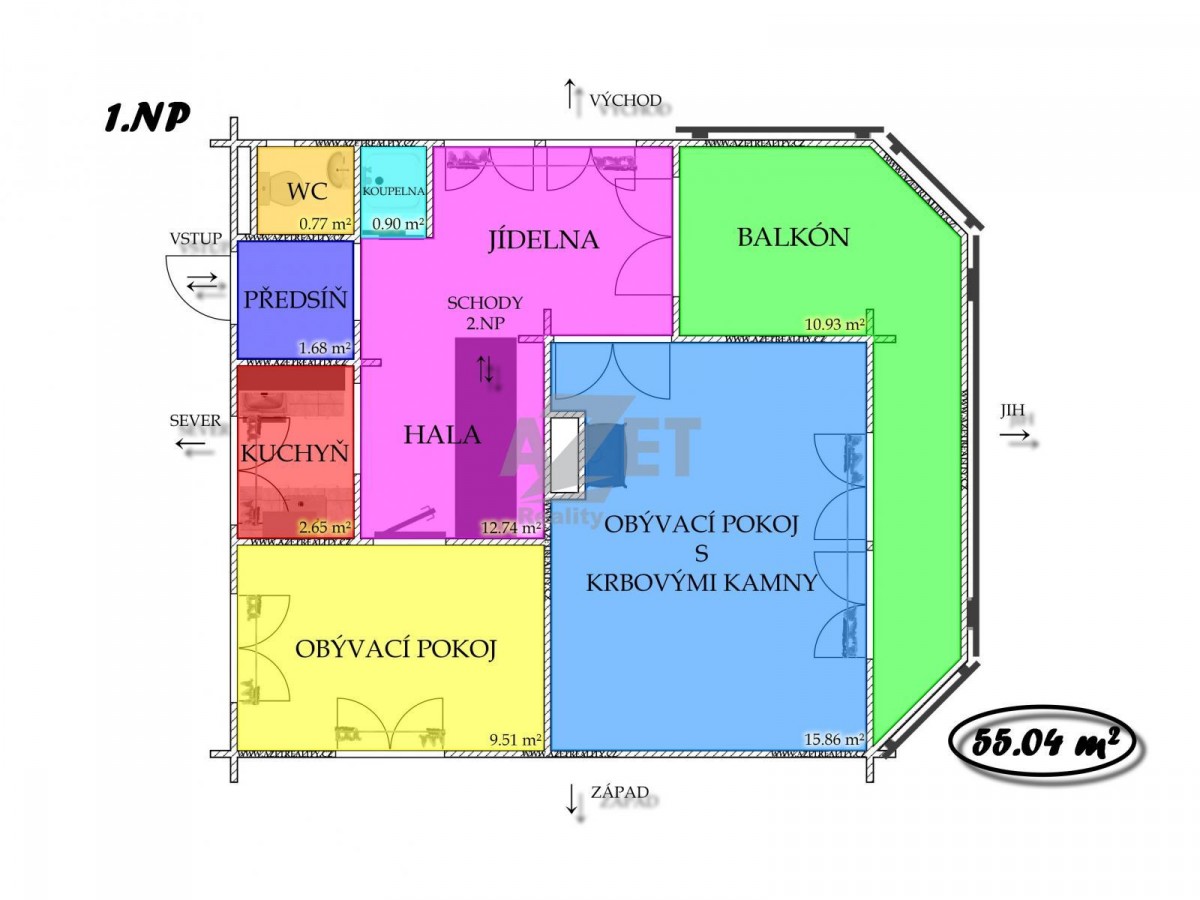 1. NP (první nadzemní patro) (55. 04 m2) - předsíň, samostatné sociální zařízení WC, koupelna, hala s jídelnou, kuchyně, balkón, obývací pokoj s krbovými kamny, další obývací pokoj, schodiště do 2. NP (druhé nadzemní patro)
