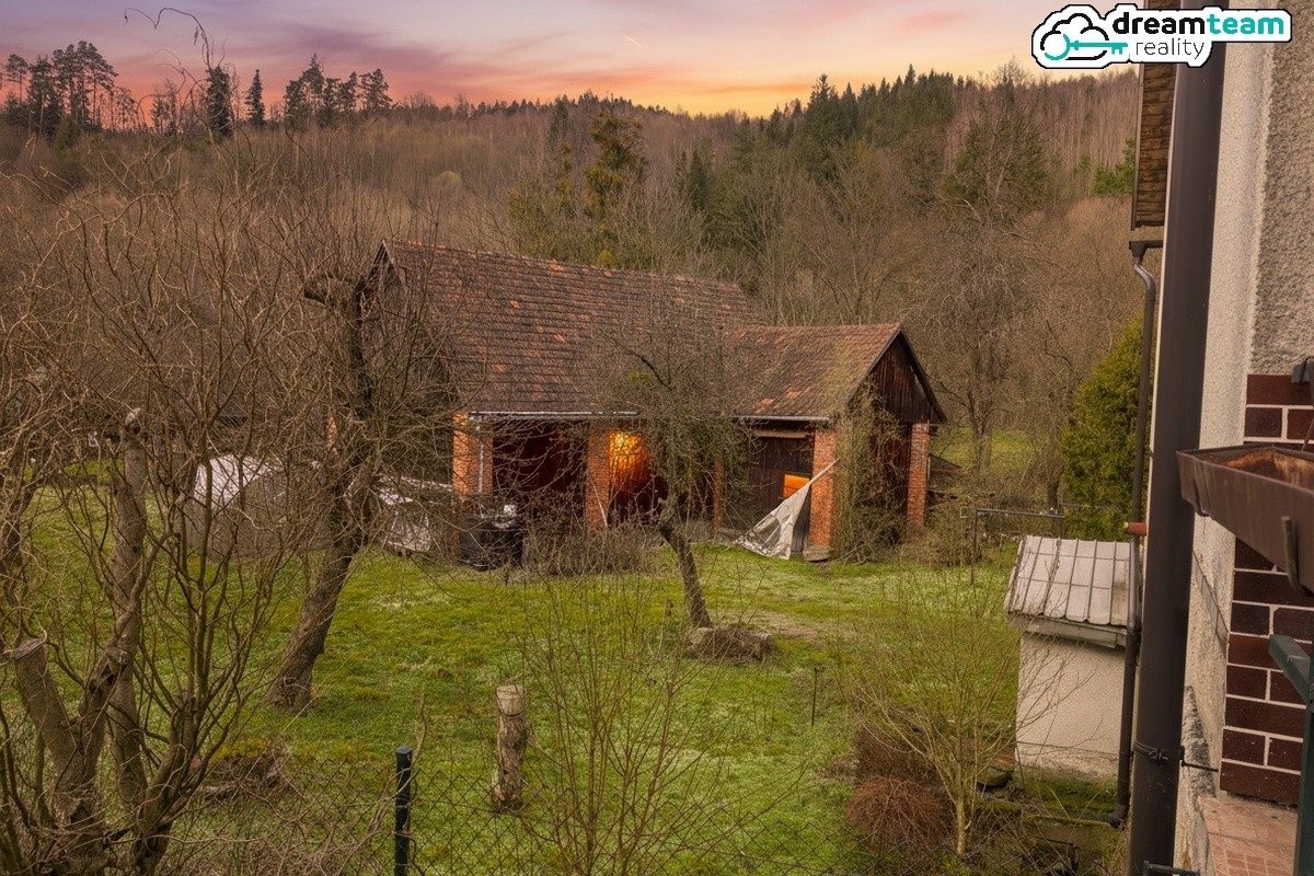 Velká zahrada s potenciálem pro záhony, ovocné stromy nebo jen hamaku mezi dva kmeny. Říčka Bystřička tvoří přirozenou hranici pozemku – dětský ráj, rybářův sen. Jeden soused, nadšený chatař. Klid zaručen. Stačí objednat skleník a sklízet a sklízet.
