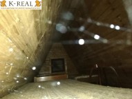 Chata je o rozloze asi 40 m2 (jedná se o obestavěný mobilheim, taková unimobuňka se střechou do špičky), plocha samotné chaty je menší, asi 15 m2, ale kolem chaty je relativně velká dřevěná terasa, chata je také dřevěná, v přízemí je jedna místnost a po schodech nahoru v podkroví je druhá místnost na spaní. V přízemí je i malinké zázemí - kuchyňka s plynovým sporákem a pod schody je lednice.