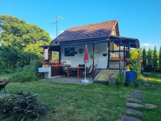 Chata stojí na vlastním pozemku. Zahrada o výměře 406 m2...> je v pronájmu od města.