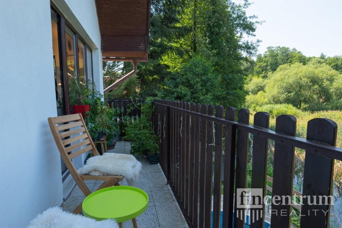 Otevřenou verandou vstoupíme do bytové jednotky 3+1, rozdělené do dvou pater, kdy při vstupu míjíme koupelnu s hydromasážní vanou i sprchovým koutem a vstupujeme do obývacího pokoje s prostorným balkonem a s navazující kuchyní. Srdcem obýváku jsou krbová kamna, která jsou také připojena na centrální rozvod topení v celém domě. Dřevěným schodištěm se dostaneme do klidové části domu se dvěma neprůchozími pokoji.