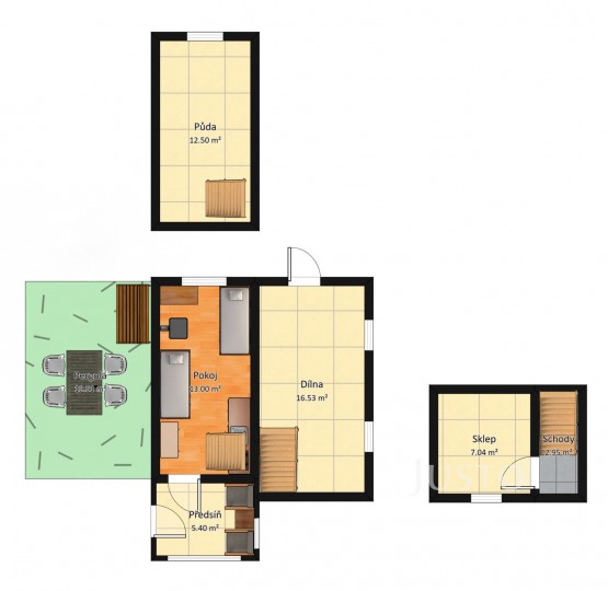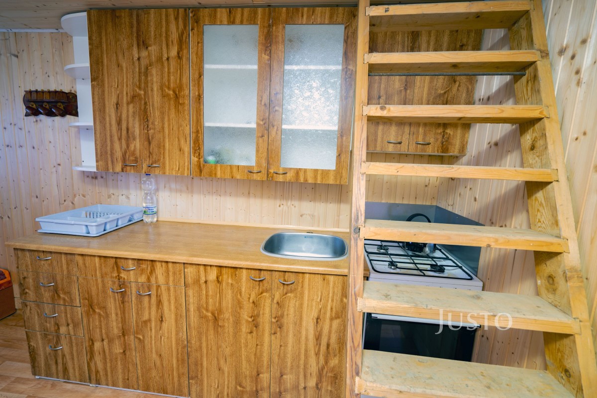 K vytápění slouží krbová kamna, vaření je v kuchyňské lince řešeno plynovým vařičem a vybavení chaty je součástí prodeje. Nechybí zde ani dílna na nářadí o velikosti cca. 17m² a sklep s plochou cca. 7m² na uložení přebytků ze zahrady.