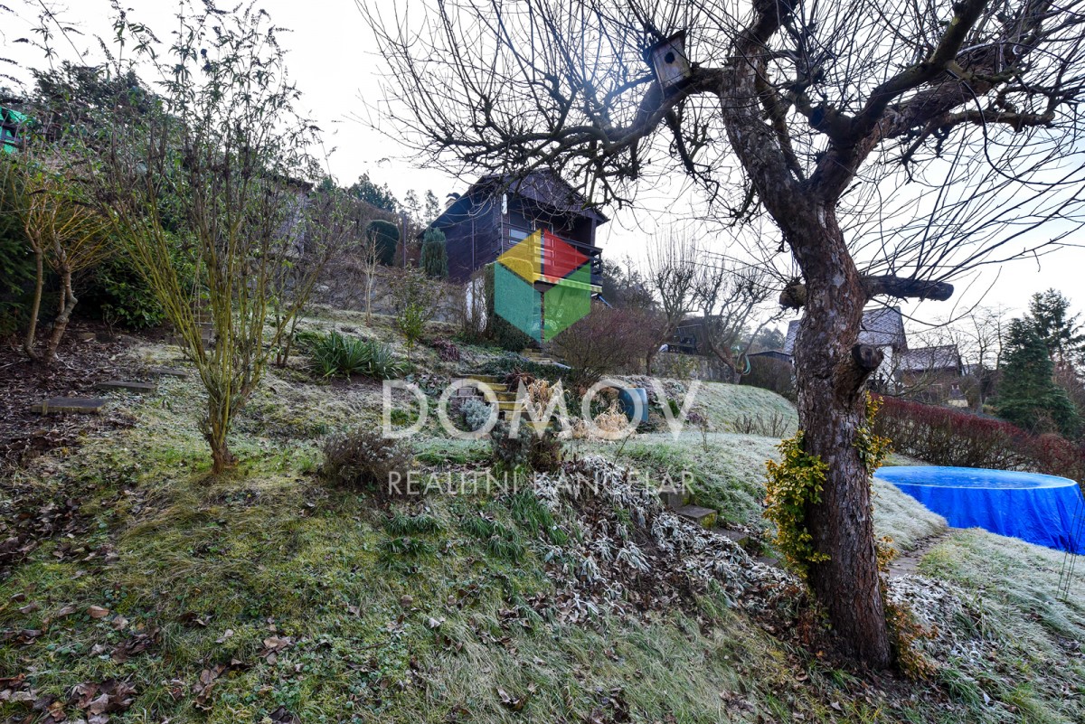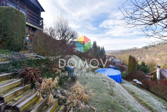 Pozemek je rozdělen zídkami do několika úrovní - s posezením, záhony a bazénem. Stojí zde domek na nářadí a kůlna, k dispozici je venkovní krb s vydlážděnou plochou na posezení.