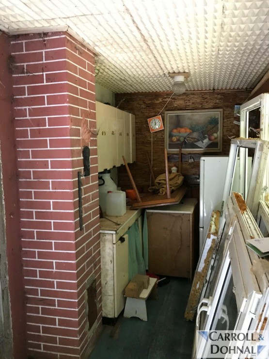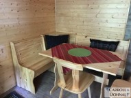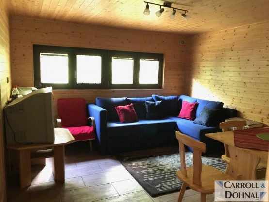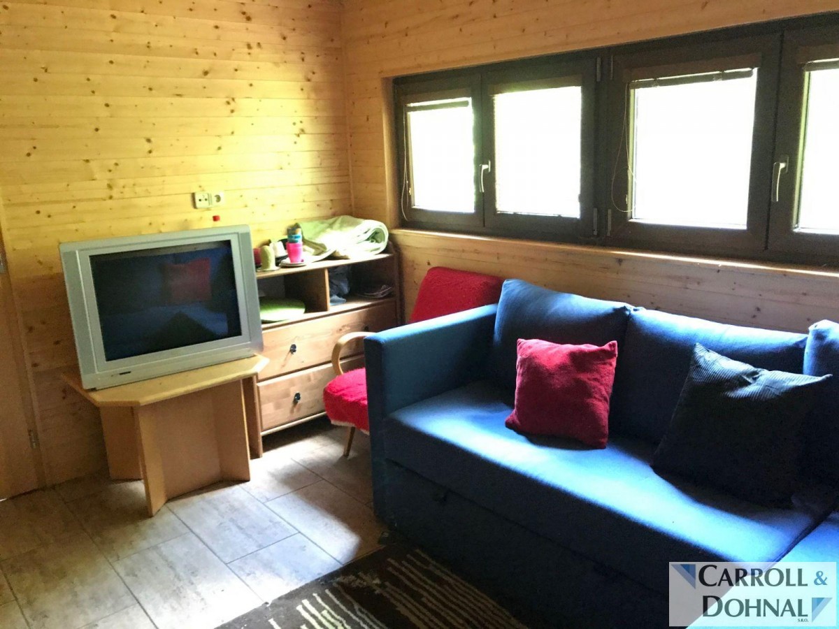 Vstupními dveřmi se vchází do chodby spojené s kuchyní, kuchyňská linka nachystaná k rekonstrukci, k níž z důvodu prodeje již nedošlo. Z chodby vstup do hlavní místnosti - obývacího pokoje obloženého dřevem. Sedací souprava a jídelní stůl se židlemi. Z obývacího pokoje vstup do ložnice - manželská postel a palanda, tj. místo na spaní pro 4 osoby.