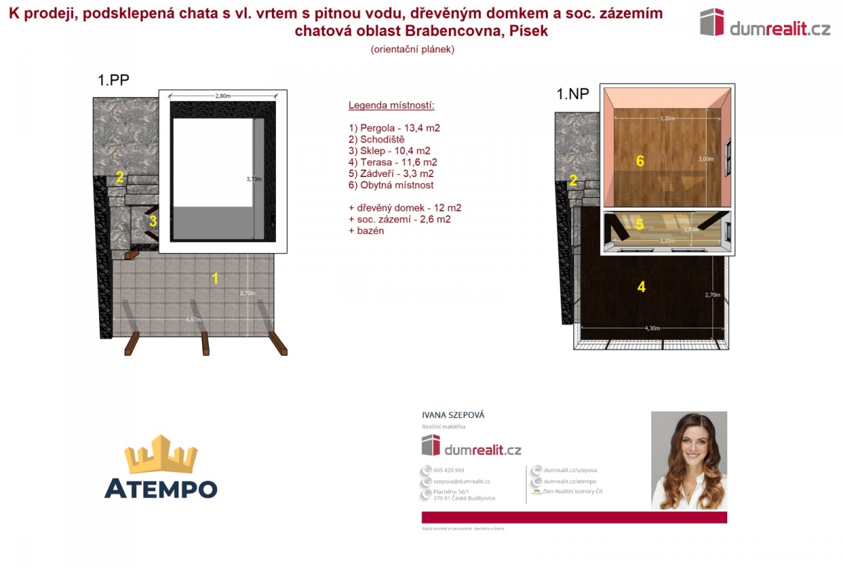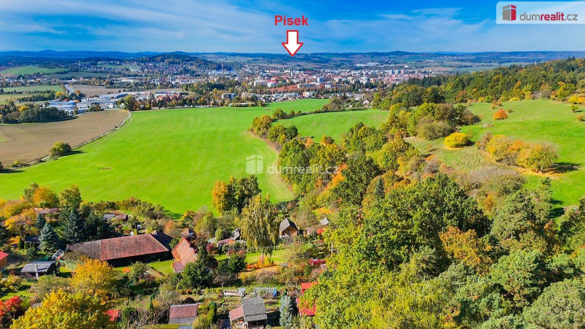 Cena je včetně provize RK právního servisu. Více info Vám poskytne makléřka Ivana Szepová. . Dumrealit. cz Vám nabízí prodej podsklepené chaty s terasou s výhledem na město, pergolou, vlastním vrtem s pitnou vodu, elektř...inou a pozemkem o celkové výměře 335 m² na okraji klidné, uzavřené, oplocené a zamčené zahrádkářské kolonie Brabencovna, jen 5 minut od centra Písku. Součástí prodeje je pozemek parc. č. 1402/28 o výměře 335 m² a pozemk parc. č. st. 4473 o výměře 24 m², to vše je zapsané na LV č. 16160 v katastrálním území Písek. Na pozemku se nacházejí 2 dřevěné chaty: 1) obytná 3 krát 4m; 2) se sociálním zázemím (chemické sociální zařízení WC a sprcha s ohřevem vody). Součástí prodeje je také bazén. Objekt je připojen na elektřinu. Hloubka vrtu činí 27 metrů. Místo je ideální pro rekreaci a zahrádkářské využití s moc hezkým výhledem na město Písek. Více info poskytne realitní makléřka Ivana Szepová z realitní kanceláře A TEMPO fungující pod ochrannou známkou dumrealit. cz. Ev. číslo: 652877. Energetický štítek: G