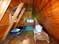 V přízemí se nachází prostorný obývák s krbem a kuchyňským koutem, v patře ložnice. K zahřátí v chladných dnech slouží krb