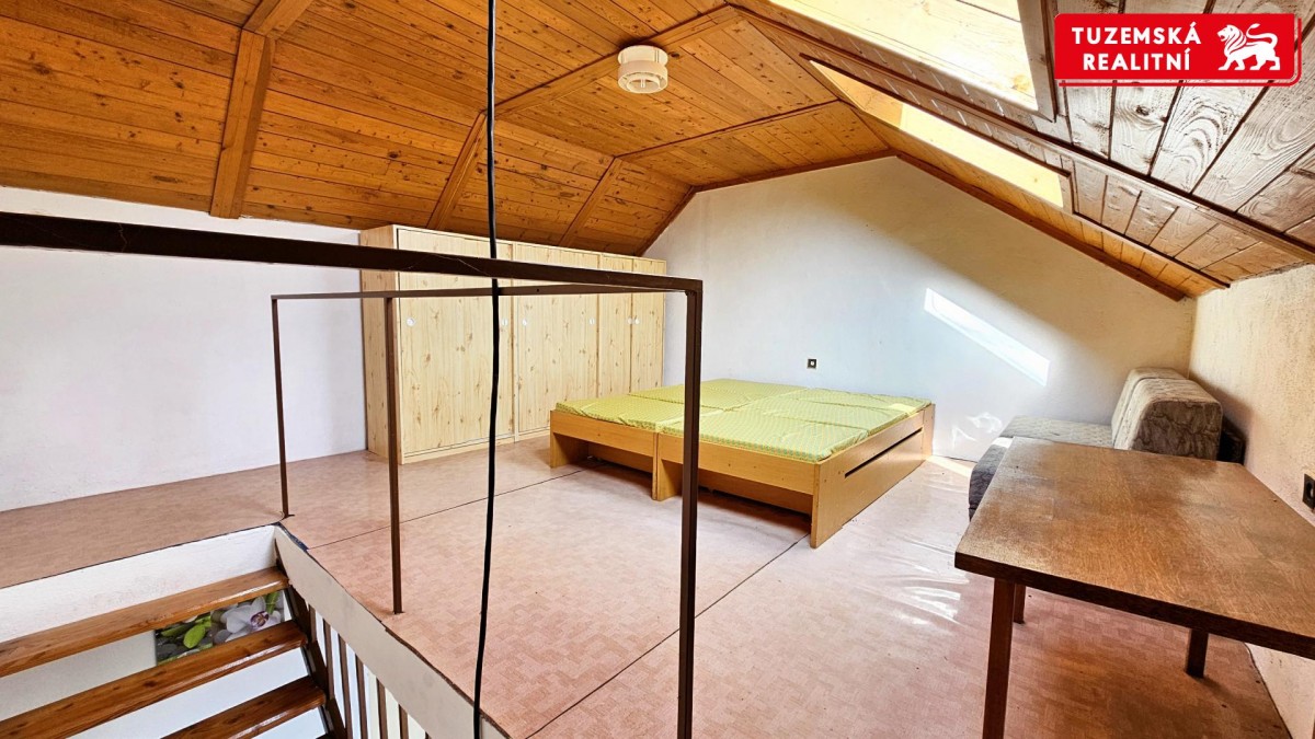 Suterénní místnost s krbem 14m2, v patře obývací pokoj s KK 19, 38m2, koupelna s sociální zařízení WC 4m2, v podkroví pokoj 19, 55m2. Dřevěná kolna na nářadí 4, 38m2, dřevník. Terasa dolní 8, 32m2, terasa horní 5, 70m2, terasa zahradní 8, 9m2.