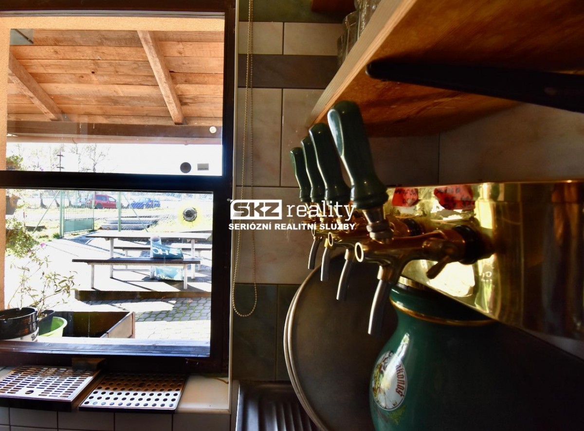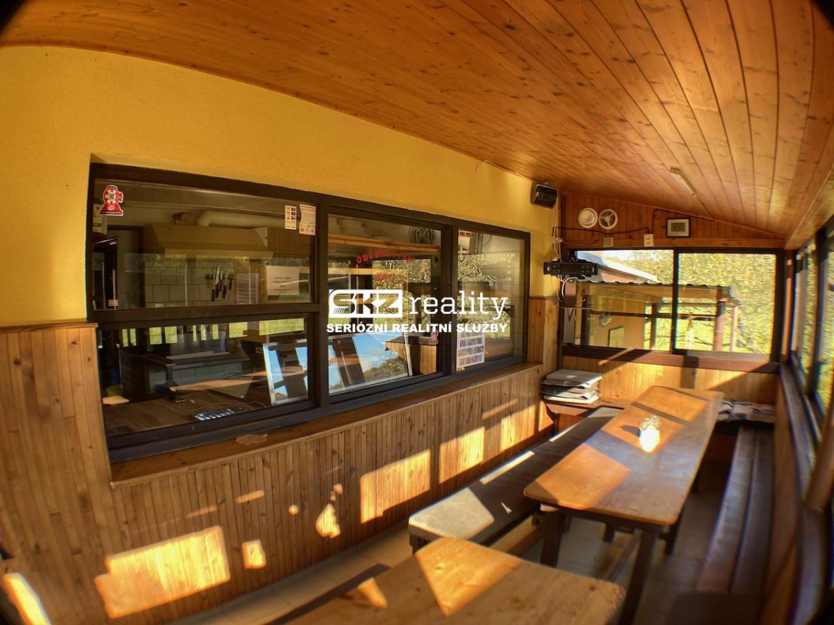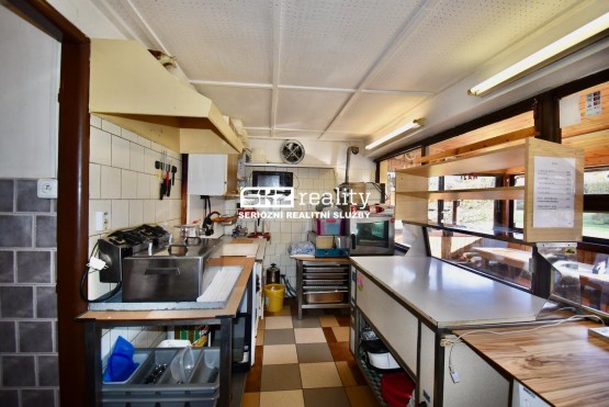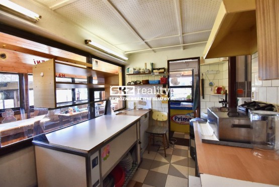 Základem všeho je zděná stavba, kde najdete vše, co k provozování hostinství potřebujete. Dispozice jsou znázorněny na fotografii půdorysu. Zadním vstupem se dostanete do chodby. Vlevo se nachází 2 prostory: sociální zařízení WC s umyvadlem a kuchyně. Vpravo je přípravna, čep s výdejním okénkem a prostor pro výdej zmrzliny. Výdej jídel, fritéza, konvektomat, mikrovlná trouba atd. je největším pracovním prostorem a je na konci chodby s výdejním oknem do prostoru uzavřeného posezení pro hosty. Dispoziční uspořádání stavby je deální pro rychlou a pohodlnou přípravu jídel a nápojů se snadným obstaráváním hostů. Na severovýchodní straně se nachází přístavba, kde najdete sociální zařízení WC pro hosty a sprchový kout pro personál. Součástí nabídky je mj. vagon, karavan, dva prodejní stánky a 2 foliovníky. Lze využít i studnu pro čerpání užitkové vody.
