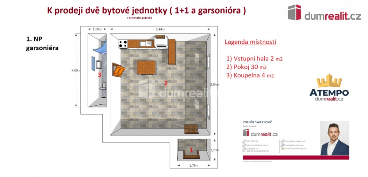 Cena je včetně provize RK a právního servisu. Více info na www. ATEMPOREALITY. cz. . Dumrealit. cz Vám nabízí koupi dvou bytových jednotek o dispozici 1+1 a ...uchyňský kout">1+kk ve zděném bytovém domě na adrese J. Š. Baara č. p. 2614, centrum města České Budějovice. Oba byty jsou momentálně zapsané jako 1 bytová jednotka v BD se samostatným vchodem a společným zádveřím. Historicky byly bytové jednotky propojeny a sloužili jako jeden rozlehlejší byt. V přízemí domu (1. NP (první nadzemní patro)) se nachází bytová jednotka o dispozici 1+kk (viz orientační plánek a fotografie). Druhá bytová jednotka (1+1) se nachází v podkroví domu (3. NP (třetí nadzemní patro)), do které se dostaneme přes společné zádveří, technickou místnost s úložnými prostory a schodiště. Bytové jednotky nemají podružné měření. Vytápění a ohřev teplé vody je plynovým kotlem umístěným v tech. místnosti v přízemí domu. Bytový dům je připojen na městkou kanalizaci a veřejný vodovod. Bytové jednotky jsou pronajaty solidním nájemníkům. Vhodné k investici. Výnosy z pronájmu Vám předloží makléř při prohlídce nemovitosti. Více info Vám poskytne realitní makléř Zdeněk Swiersovič z realitní kanceláře A TEMPO fungující pod ochrannou známkou dumrealit. cz. Zajistíme Vám financování a veškerý právní servis. Ev. číslo: 646584. Energetický štítek: G