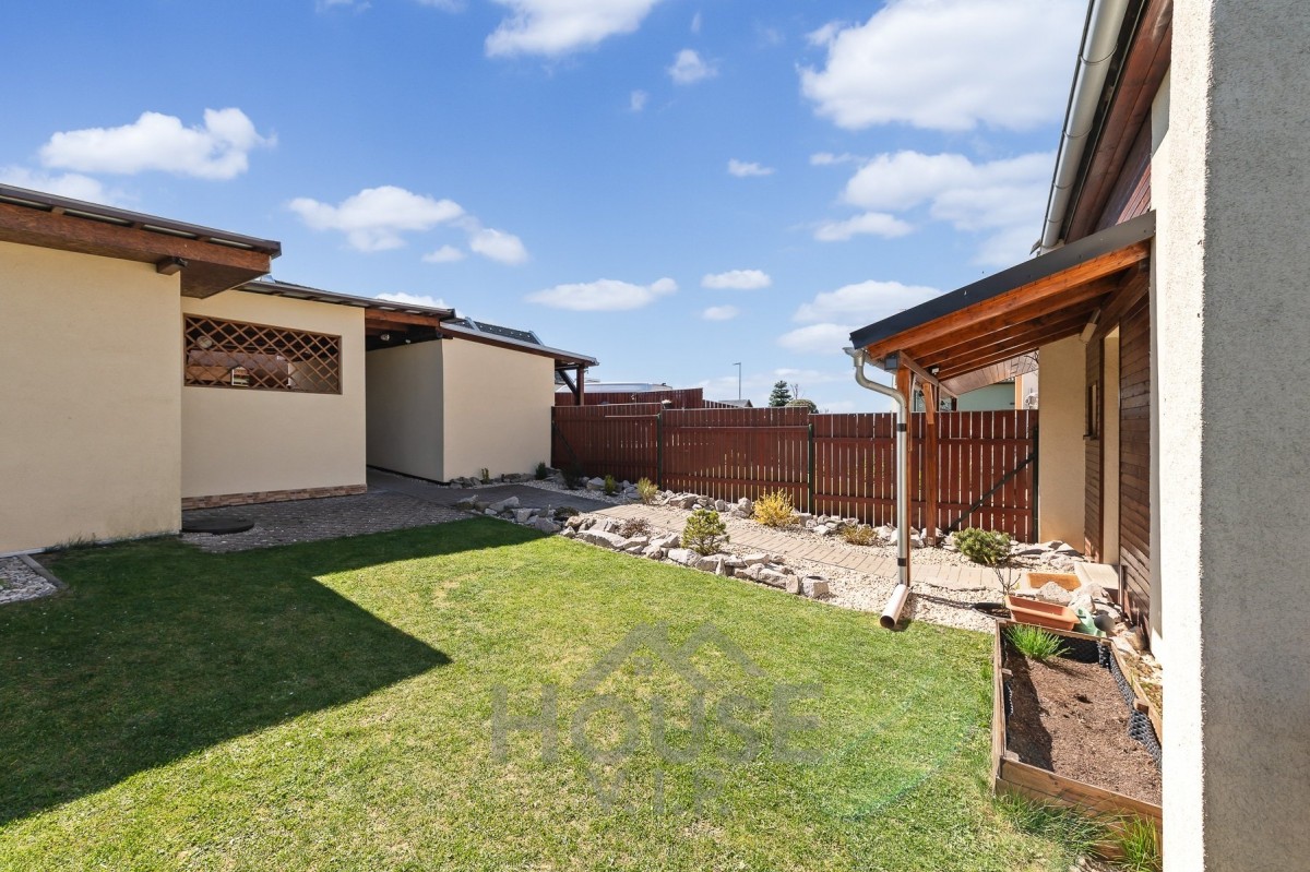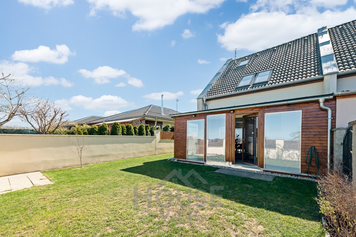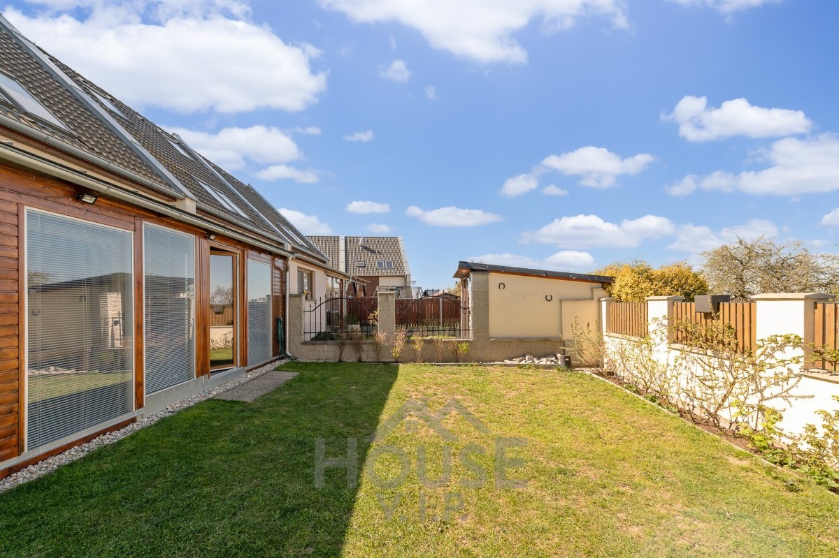 K domu náleží garáž pro dvě auta, zahradní domek a příjemná zahrada, která poskytuje dostatek soukromí i prostoru pro odpočinek či volnočasové aktivity.