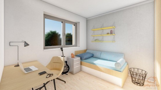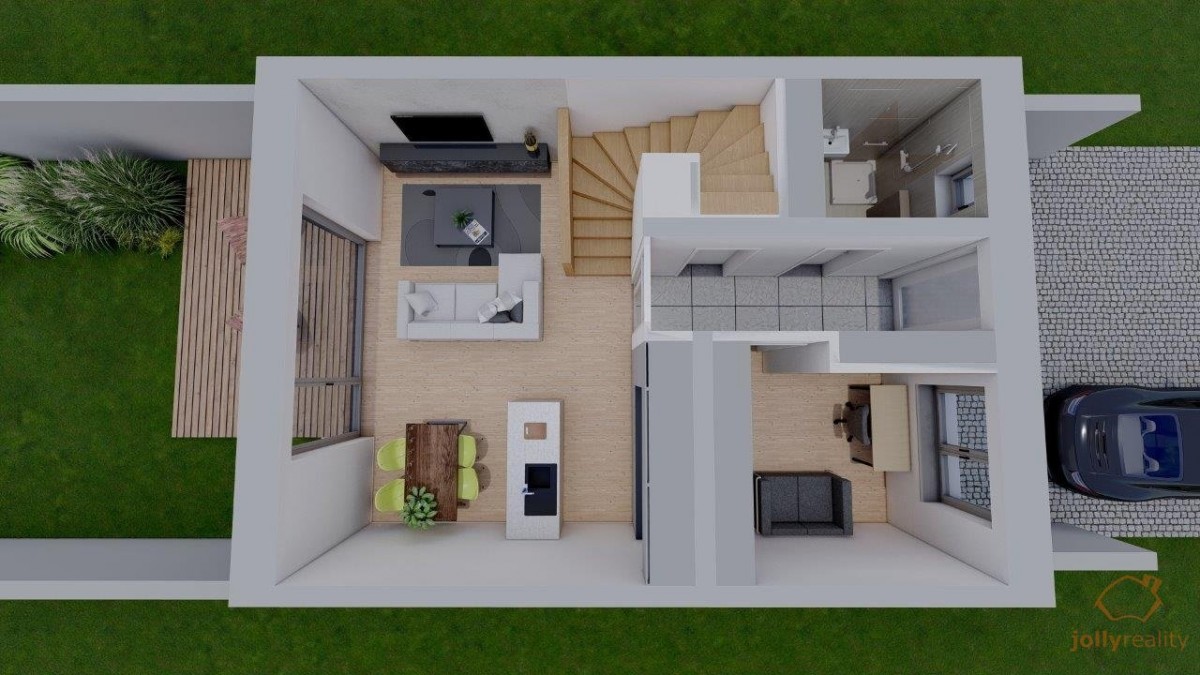 V 1. NP (první nadzemní patro) se nachází prostorný obývací pokoj spojený s kuchyní o výměře 27, 44 m2 se vstupem na terasu 15 m2, pracovna 9, 07 m2, vstupní chodba 5, 94 m2 a technická místnost 4, 43 m2. U kuchyně je místnost na uskladnění potravin 2, 98 m2.