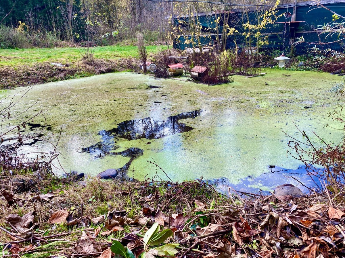 Kolem domu je velká zahrada 1. 741 m2 s množstvím okrasných stromů a jezírky. Na pozemku se využívá dešťová voda z jímky a blízké řeky.