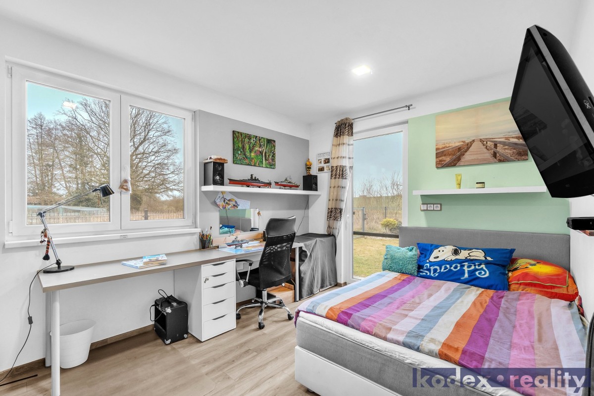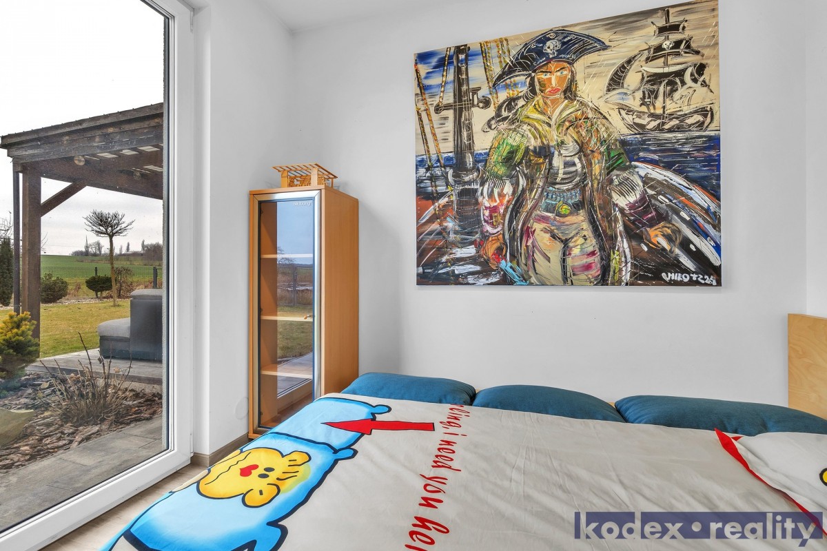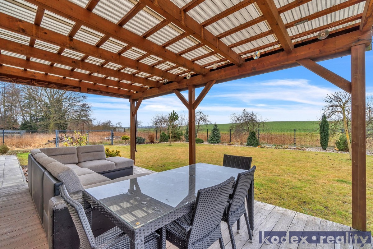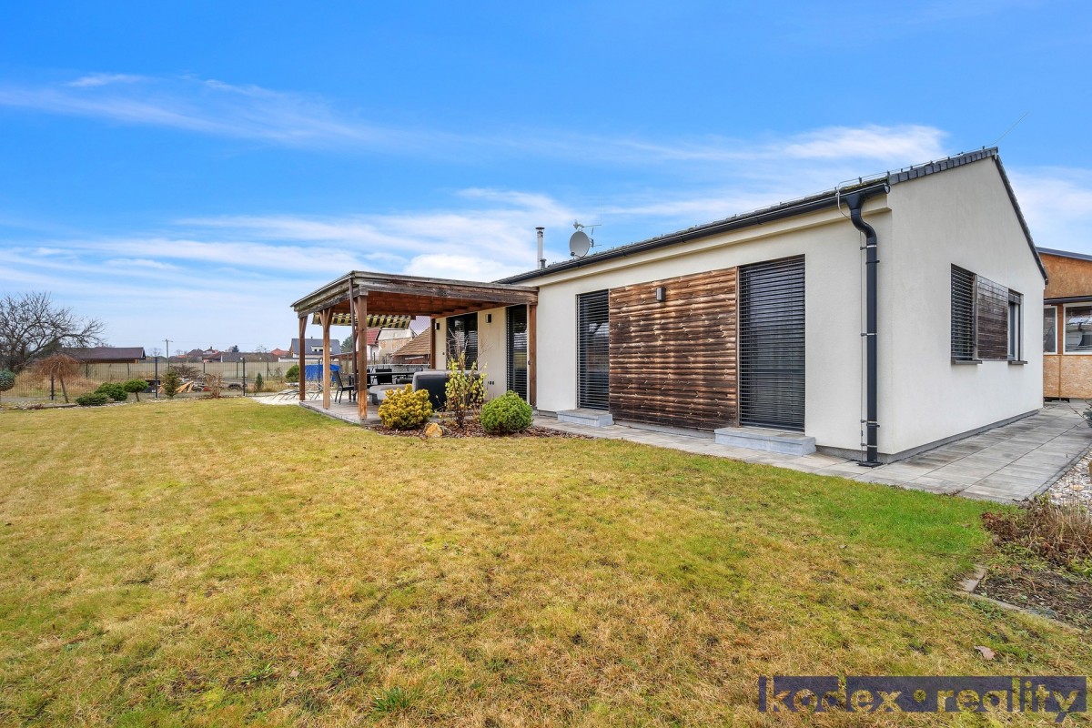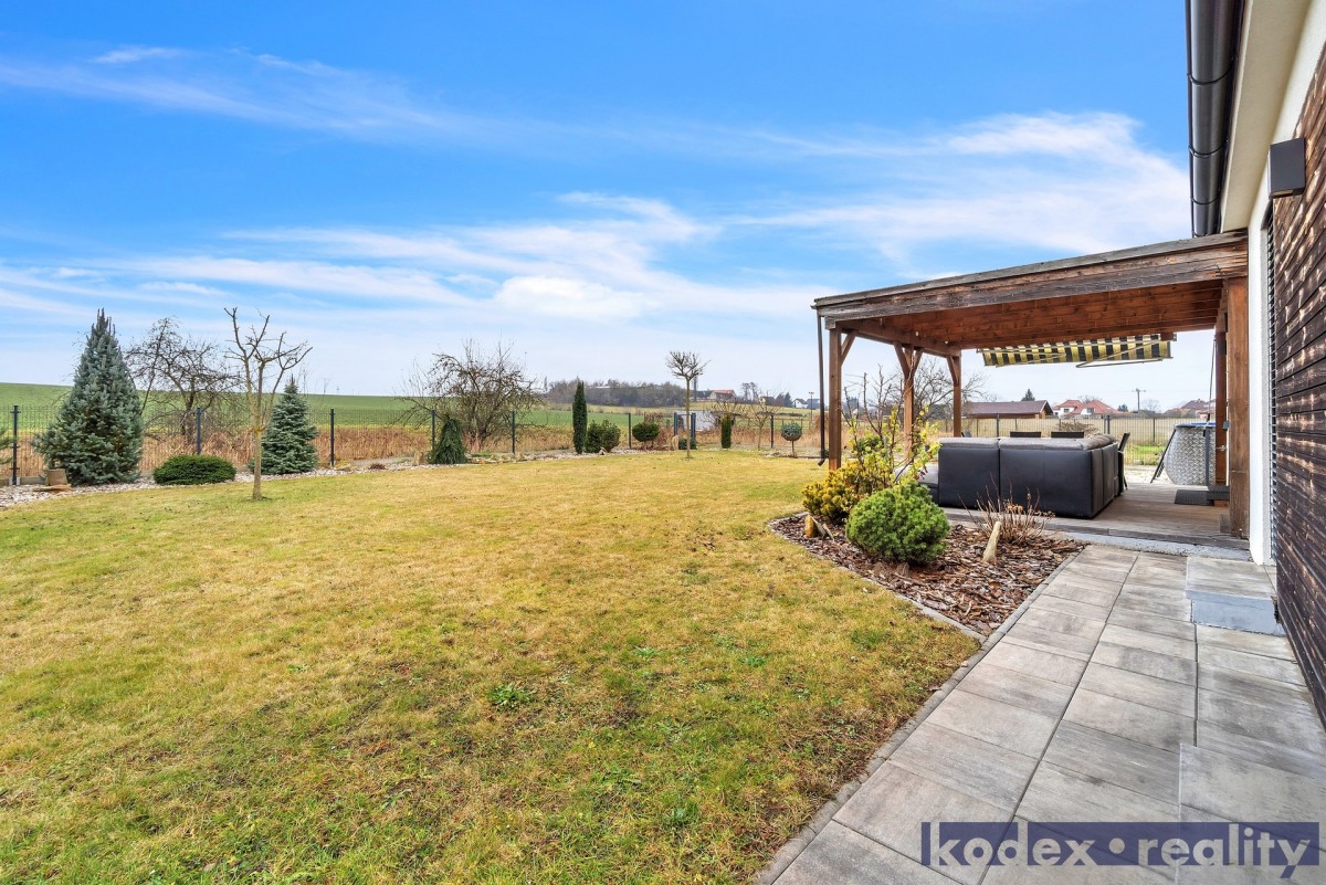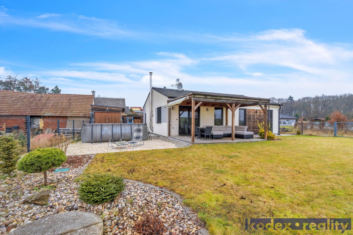 Dispozice: krytý vstup, zádveří s vestavěnou skříní a technickou místností, obytná místnost s kuchyňským koutem se spíží, chodba s přístupem na půdu, koupelna s vanou, sprchovým koutem a saunou, komora, ložnice, dětský pokoj a pracovna a krytá terasa. Vedle RD (rodinný dům) stojí dílna a sklad na kola, motorky apod. Před domem je postaveno velké garážové stání pro 2 - 3 auta včetně dodávky. Pozemek je kompéletně oplocen a vpředu je elektricky ovládaná vjezdová brána. Okrasná zahrada je vybavena zavlažovacím systémem, venkovní sprchou, bazeném a krytou terasou.