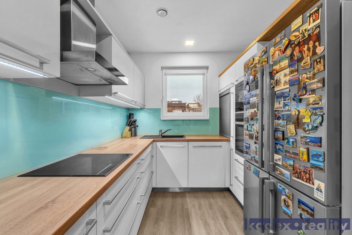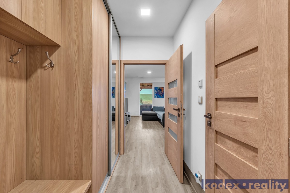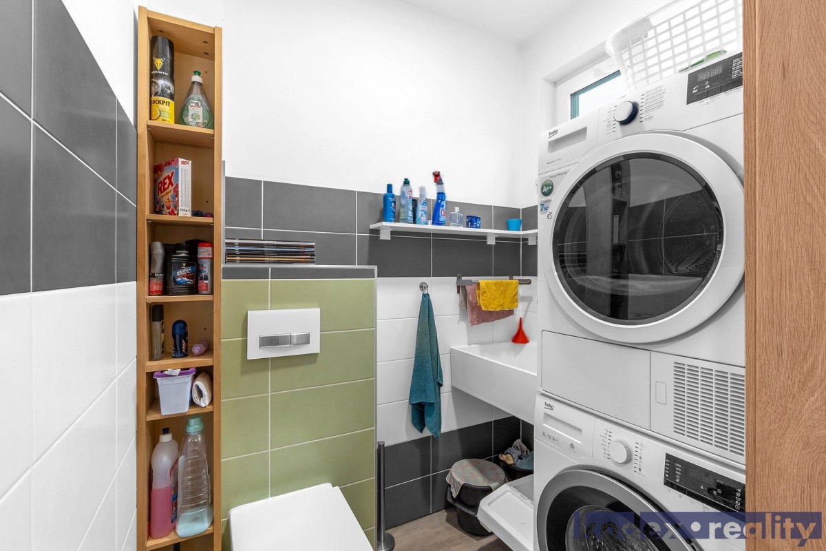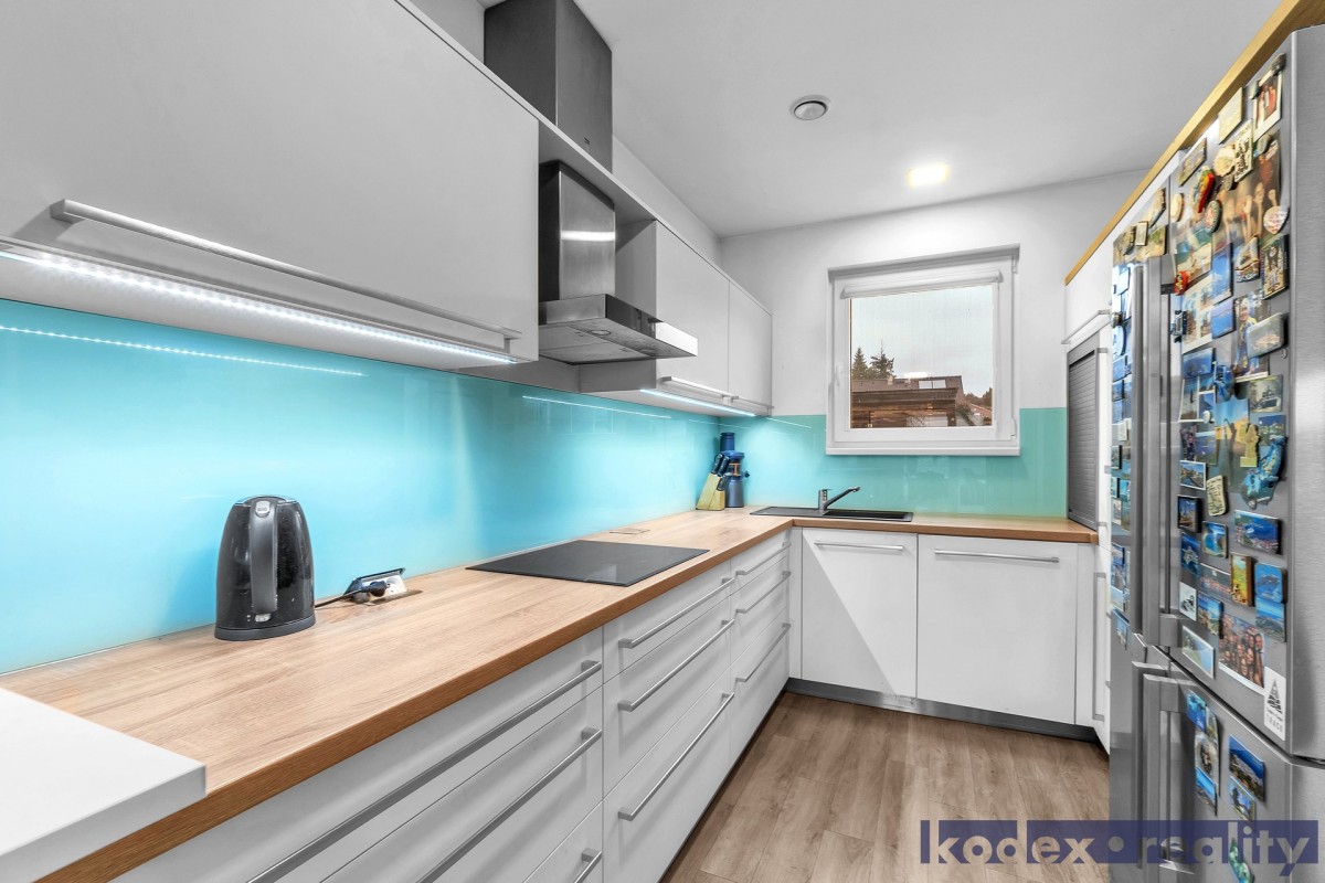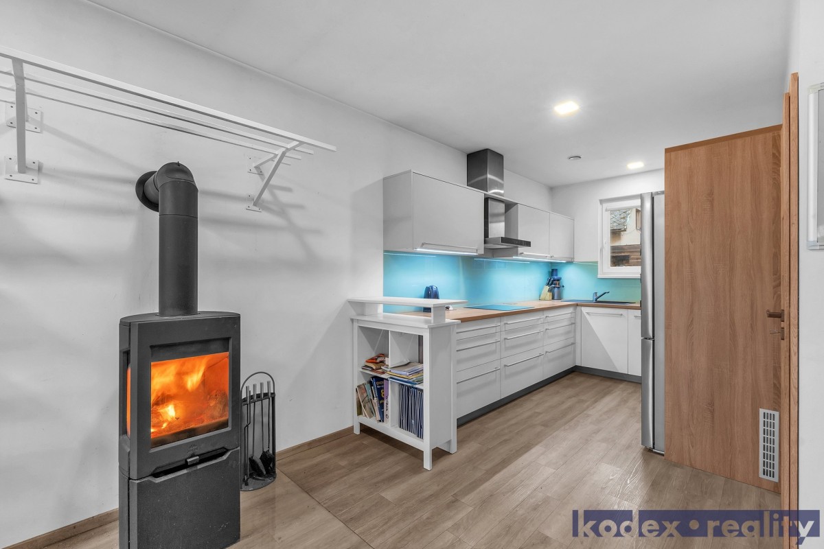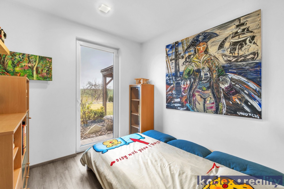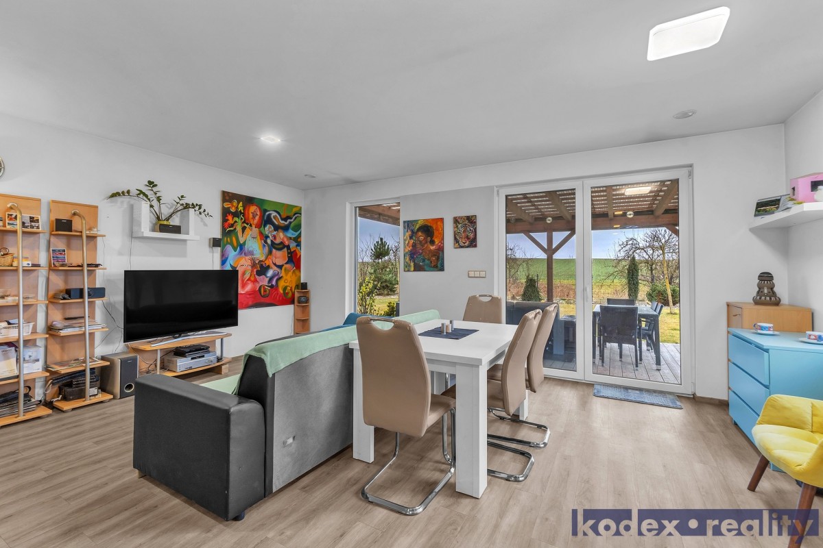 Dispozice: krytý vstup, zádveří s vestavěnou skříní a technickou místností, obytná místnost s kuchyňským koutem se spíží, chodba s přístupem na půdu, koupelna s vanou, sprchovým koutem a saunou, komora, ložnice, dětský pokoj a pracovna a krytá terasa. Vedle RD (rodinný dům) stojí dílna a sklad na kola, motorky apod. Před domem je postaveno velké garážové stání pro 2 - 3 auta včetně dodávky. Pozemek je kompéletně oplocen a vpředu je elektricky ovládaná vjezdová brána. Okrasná zahrada je vybavena zavlažovacím systémem, venkovní sprchou, bazeném a krytou terasou.