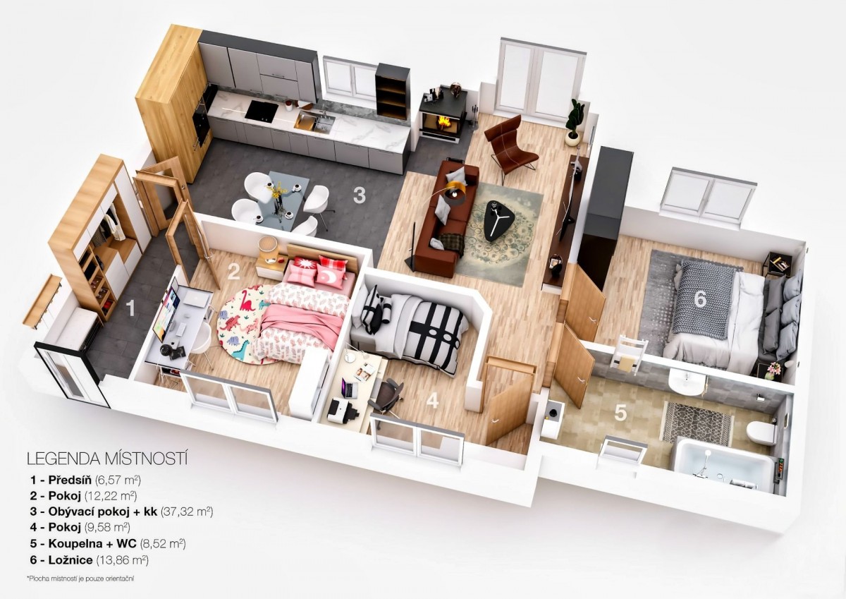 Nová koupelna s sociální zařízení WC, vana akrylátová, umývadlo, topný žebřík, nový obklad a dlažba. V koupelně rovněž instalována voda s odpadem pro pračku.