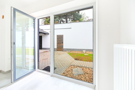 Okna plastová s izolačním trojsklem včetně francouzských dveří z obývacího pokoje, nové vstupní dveře do domu.