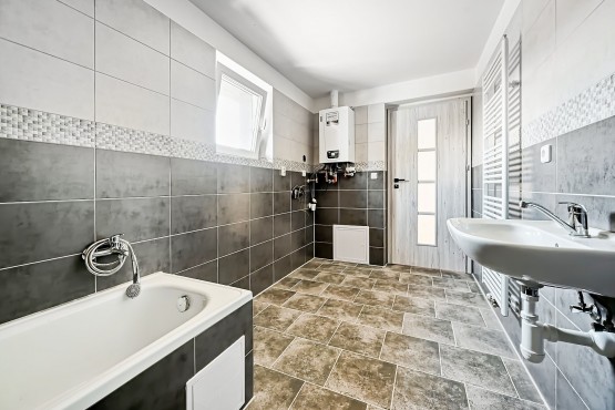 Nová koupelna s sociální zařízení WC, vana akrylátová, umývadlo, topný žebřík, nový obklad a dlažba. V koupelně rovněž instalována voda s odpadem pro pračku.