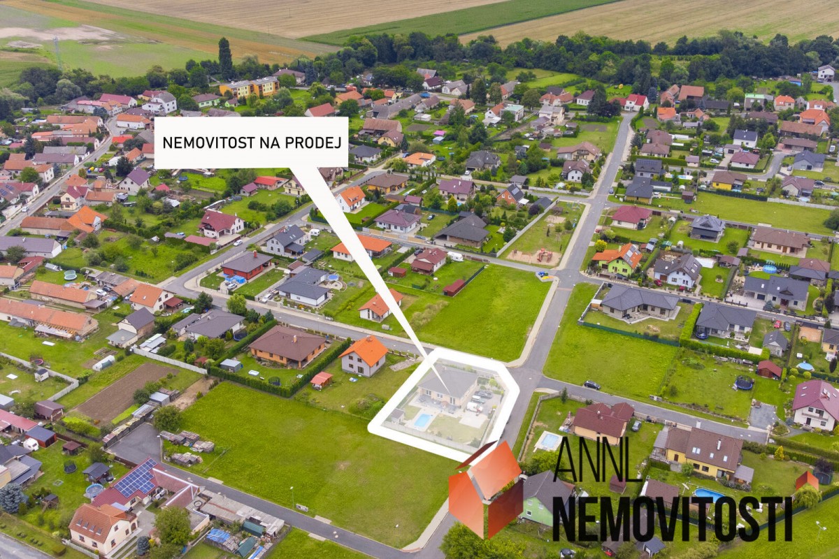 Dům je o dispozici ...chyň">4+1. Vjezdová brána na elektrický pohon Vás zavede na 4 parkovací místa na pozemku, vedle kterých je vydlážděná plocha s košem na basket, která jde použít také na parkování. Od vchodové branky vede dlažba okolo dvou jezírek ve kterých mají majitelé moc hezké KOI kapry a pokračuje podél celého domu. V zadní části domu je velká terasa s nafukovací vířivkou, lehátky a posezením. Před ní je bazén a vedle něj zahradní domeček.