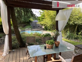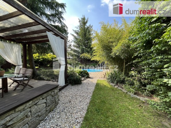 Jedná se o moderní logicky řešenou stavbu, s obývacím pokojem s kuchyňským koutem a velkoprostorovými okny a dvoukřídlé posuvné velkoformátové dveře se vstupem na terasu, jejíž orientace je na jih do moc hezké zahrady s bazénem a další samostatnou terasou. Výhodou zahrady jsou vzrostlé stromy, malá japonská zahrada, skalka, vzrostlý bambus to vše v soukromí bez možnosti pohledu z ulice. Obývací pokoj je současně s kuchyňským koutem, který je kompletně vybavený značkovými spotřebiči, například i drtičkou odpadu. Samostatné sociální zařízení WC s umyvadlem, je v blízkosti obývacího pokoje a je určené pro hosty. V klidové zóně jsou tři samostatné pokoje, velká koupelna včetně vany, sprchového koutu, bidetu a sociální zařízení WC, velká šatna a technická místnost ve které je pračka, sušička, elektrický kotel a boiler na TUV. Ve vstupní chodbě je velká vestavěná skříň. Dům je energeticky velice nenáročný vzhledem k použitým tepelně izolačních materiálů a kvalitních oken. Nad dvougaráží, která stojí samostatně je velice pěkný útulný byt o dispozici 1+kk a velikosti 30m², včetně koupelny, s sociální zařízení WC a malým kuchyňským koutem. Toto lze využít na samostatné bydlení dle Vašich potřeb, a odlišuje tuto nemovitost od ostatních. Jedná se o velice atraktivní a hojně využívanou jednotkou a to hlavně pro návštěvy. Příjezd je zajištěn pojezdovou bránou a vjezd do garáže je na dálkové ovládání. Na pozemku mohou parkovat další až 3 auta. V letošním roce je obcí schválené naopojení domu na obecní kanalizaci a vybudování nové vozovky před domem. Ev. číslo: 642604. Energetický štítek: B (92 kWh/m2/rok).