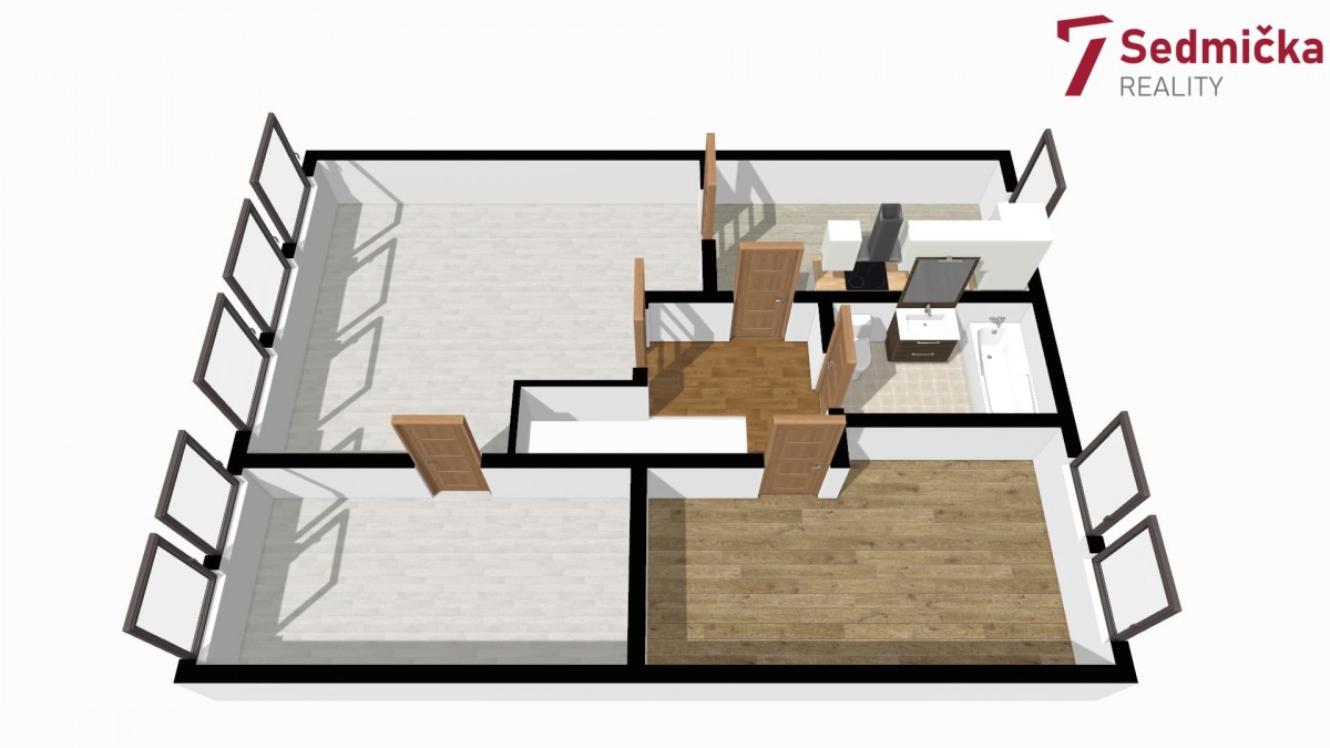 V 1. NP (první nadzemní patro) je kuchyně, tři pokoje a koupelna s sociální zařízení WC. U domu je menší pozemek s výměrou 192m2.