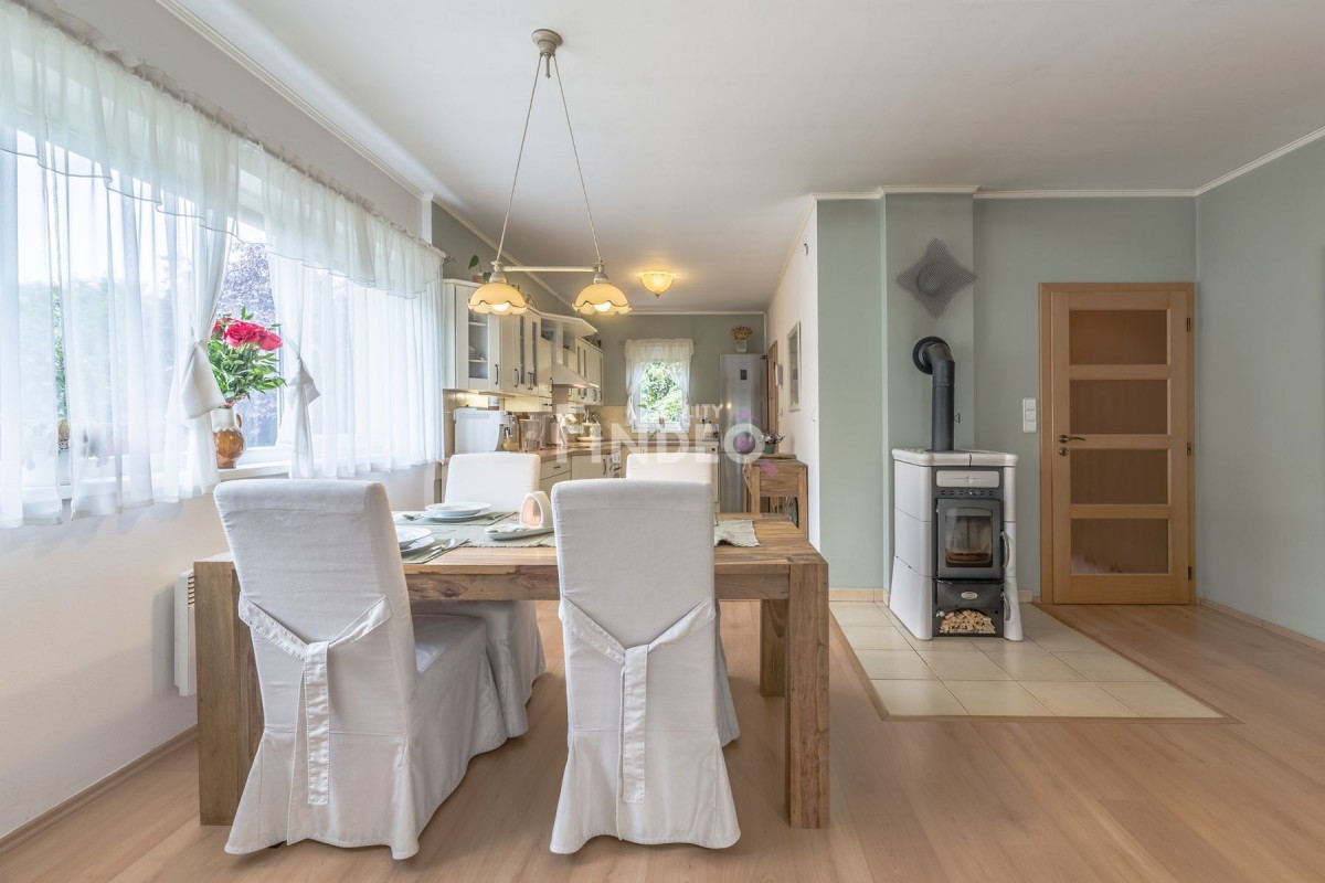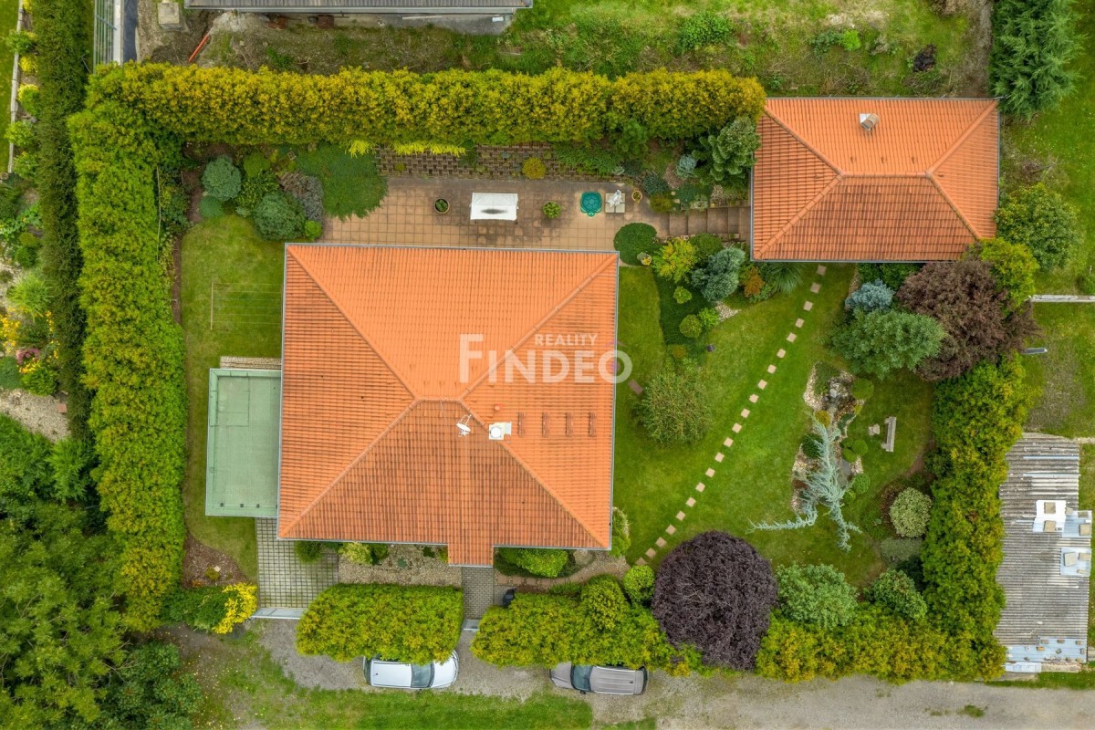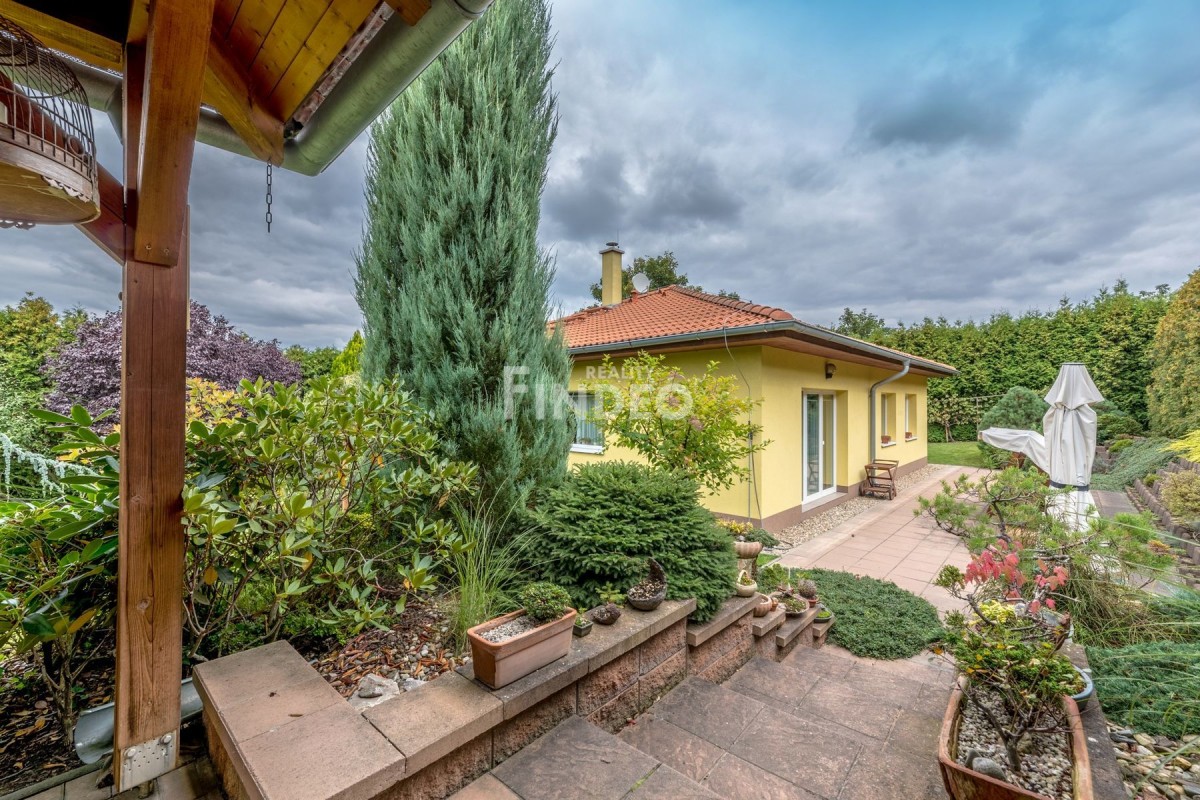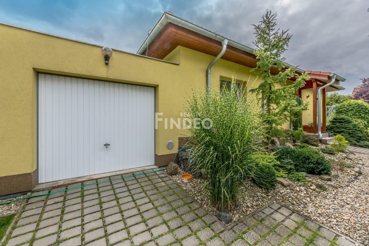 Jedná se o dům typu bungalow, který se nachází ve staré zástavbě rodinných domů a svým majitelům nabízí maximum soukromí. V domě o zastavěné ploše 151 m2 se nachází prostorný obývací pokoj (28, 32 m2) s krbovými kamny a vstupem na letní terasu (45 m2), kuchyně (9, 97 m2) s kuchyňskou linkou a velmi praktickou komorou. V domě jsou dále k dispozici tři identicky stejné pokoje (11, 49 m2), samostatná šatna, koupelna s vanou, sprchou a dvojumyvadlem, samostatné sociální zařízení WC, předsíň a chodba. V předsíni a na chodbě jsou k dispozici vestavěné skříně. K domu náleží garáž, letní terasa a pro letní grilování je k dispozici velmi prostorný zahradní altán s grilem a udírnou. Součástí altánu je samostatná místnost, kterou lze využít jako technické zázemí např. pro zahradní nářadí nebo jako dílnu.