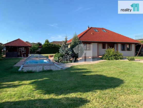 +popl. 4500 Kč. Reality 11 Vám zprostředkují prodej rodinného domu typu bungalov, dispozice 5+1, který je situován na rohovém, oploceném pozemku, velikosti 1362 s výhledem do nez...astavěné krajiny. Dům byl zkolaudován v roce 2007. V přízemí se nachází chodba, odkud je vstup do kuchyně, 2 pokojů, technické místnosti, koupelny s rohovou vanou i sprchovým koutem a samostatného sociální zařízení WC. Kuchyň s jídelním koutem volně navazuje na obývací pokoj. Z obou místností je přístup na terasu. V podkroví byly vybudovány dva pokoje a sociální zařízení WC, z toho sociální zařízení WC a jeden pokoj jsou před dokončením. U domu je krytý bazén, velikosti 6 krát 3m, samostatná garáž s elektrickým otevíráním vrat a zahradní domek s kuchyní, sociální zařízení WC a pergolou. Dům je napojen na veřejnou vodovodní přípojku, má však i vlastní vrtanou studnu. Odpad je sveden do veřejné kanalizace. Plyn je přiveden k hranici pozemku. Topení je řešeno elektrickým kotlem, teplá voda bojlerem. Dům má zabezpečovací, monitorovací systém a automatickou závlahu zeleně. Energetický štítek je ve fázi příprav, proto uvádíme energetickou třídu G.