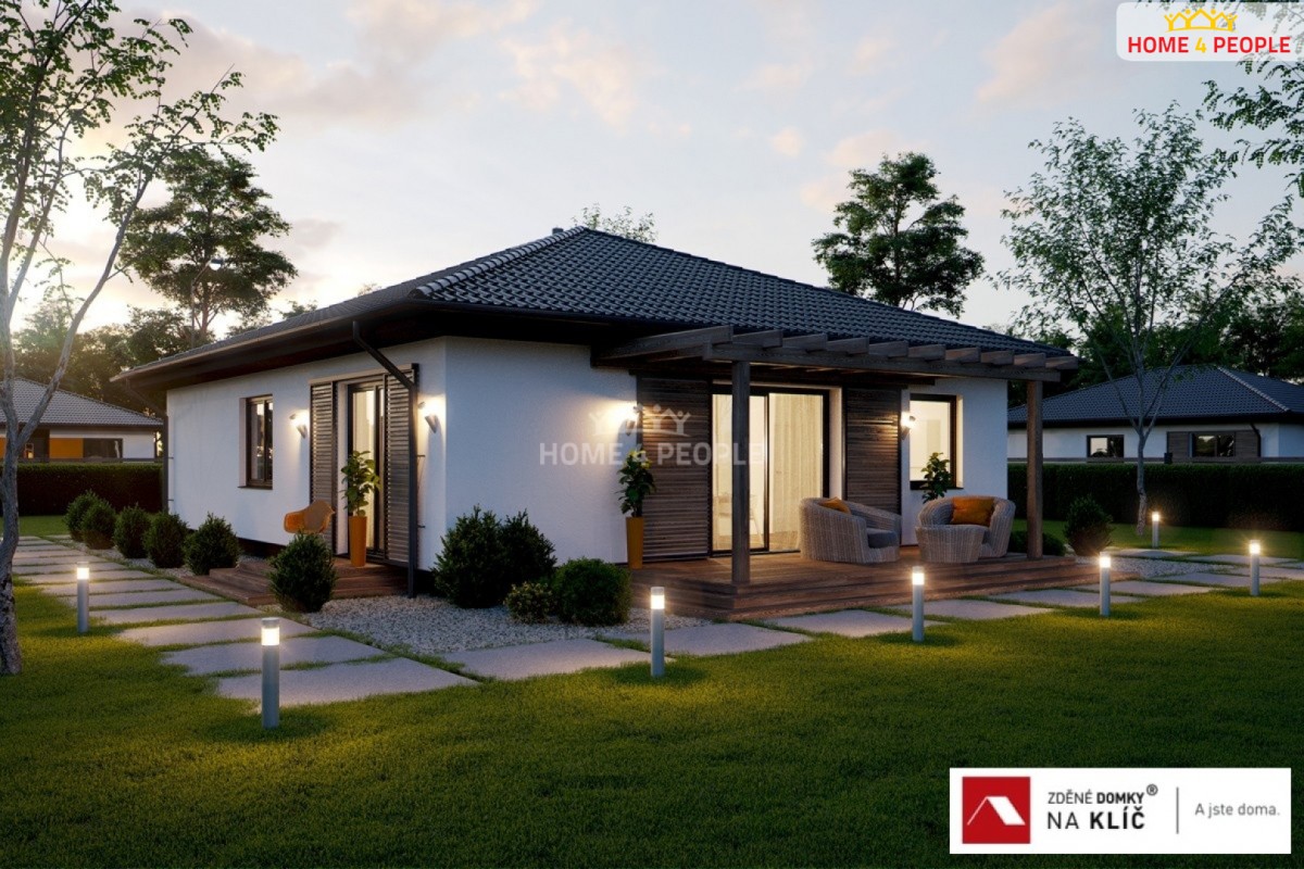 Cena včetně RD (rodinný dům) na klíč, pozemku, připojení na sítě, provize a DPH. . Zprostředkujeme Vám exkluzivní nabídku výstavby rodinného domu typu EKO 104 4+kk v provede...ní na klíč v obci Machová u Otrokovic. Projekt ekonomického domu zajištuje aktuální potřeby dnešní doby se zastavěnou plochou 125 m² a užitnou plochou 104 m². Jedná se o kvalitní zděnou stavbu z materiálu Porfix 300. Svojí jednoduchou konstrukcí je předurčený pro rychlou a nekomplikovanou výstavbu. Všechny důležité rozvody jsou koncentrované na jednom místě, což snižuje instalační náklady a poruchovost. Optimální půdorys poskytuje výborný poměr mezi velikostí plochy obvodových stěn a vnitřního prostoru. Minimální plocha obvodových stěn takto šetří náklady nejen při výstavbě, ale i při vytápění domu. Ekonomický dům je navrhnutý tak, aby měsíční provozní náklady na tento dům byly přibližně třikrát nižší než u bytu podobné podlahové výměry. Prostředky ušetřené na provozu můžete použít například na splátky hypotéky. Uvedená cena obsahuje základovou desku, projekt, DPH a stavba bude provedena na klíč a předána k okamžitému užívání. Kolaudace je samozřejmostí. (Součástí ceny není kuchyňská linka a světla – dokážeme za zvýhodněných podmínek zajisti přes naše dodavatele). V uvedené ceně můžete počítat také s finálními povrchovými úpravami exteriéru i interiéru, a to včetně elektroinstalací, sanitárního vybavení s bateriemi, interiérovými dveřmi včetně obložek a vytápění bude řešeno teplovodním podlahovým topením v kombinaci tepelného čerpadla se 180L zásobníkem na teplou vodu. Dle dohody změníme systém vytápění nebo vystavíme komín pro krbové kamna nebo pro využití krbové vložky. Kryté garážové stání spojené s domem nebo terasu za příplatek. Pro náročnější klienty máme nabídku nadstandardního vybavení chytré domácnosti, klimatizaci, externí žaluzie, rolety, rekuperaci nebo fotovoltaiku. Úprava dispozice nebo tvaru domu povolena. Délka výstavby od vydání stavebního povolení 12 - 13 měsíců. Inženýrské sítě v dosahu. Pozemek je rovinatý o výměře 777 m² o rozměrech 24 m široký a 32 m dlouhý je v územním plánu určený pro výstavbu rodinného bydlení a jeho poloha je situována mezi rod. domy. Více u makléře a to včetně dohodnutí se na prohlídce. Také nabízíme možnost si projít naše hotové domy. Změna za jiný dům je možná. Doporučuji Ev. číslo: 31863. Energetický štítek: A (45 kWh/m2/rok).