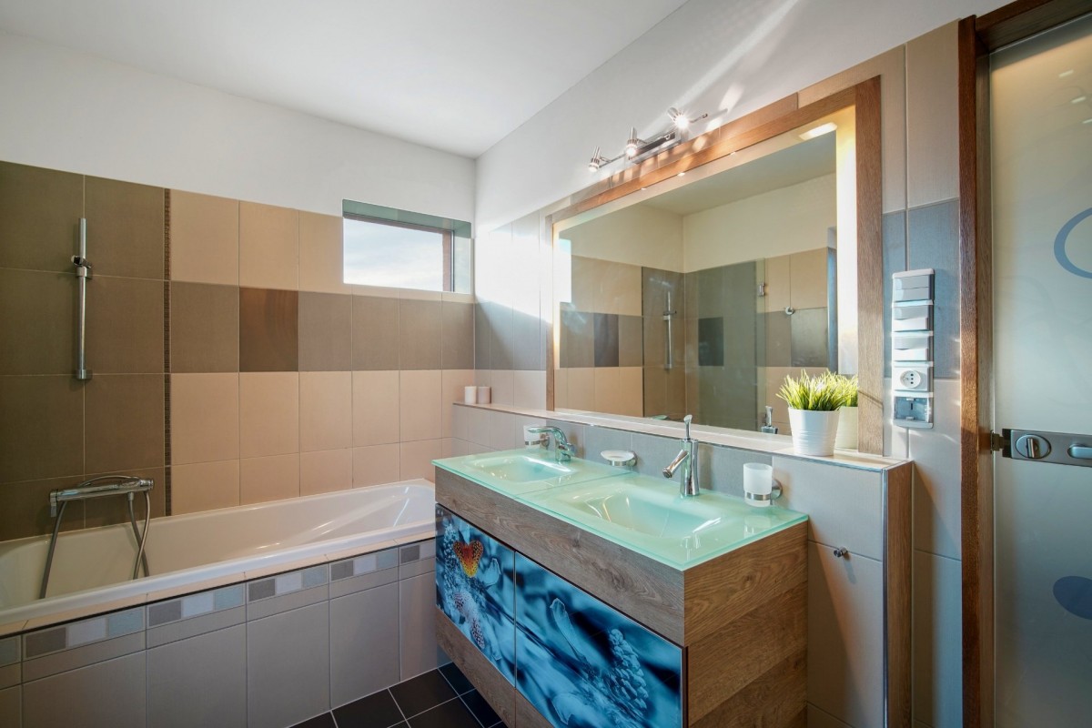 Spodní koupelna se sprchovým koutem, umývadlem a sociální zařízení WC, horní koupelna s vanou a umývadlem.