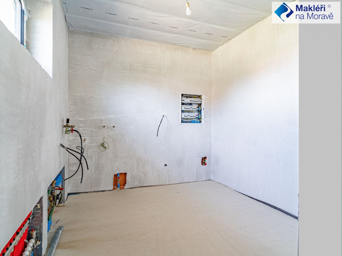 Stavební práce na domě postupně probíhají (již jsou hotové vnitřní i venkovní omítky) a pokračuje se na terénních úpravách pozemku. Další dokončování a vybavení interiéru však nechceme řešit bez Vás, proto stále čekáme na Váš výběr kuchyňské linky, vybavení koupelny, interiérových dveří a zárubní, podlah, parapetů a dokonce i fasády domu podle Vašeho vkusu. Bylo by škoda nevyužít této možnosti, dům pak může být dokončen do 1 – 2 měsíců.
