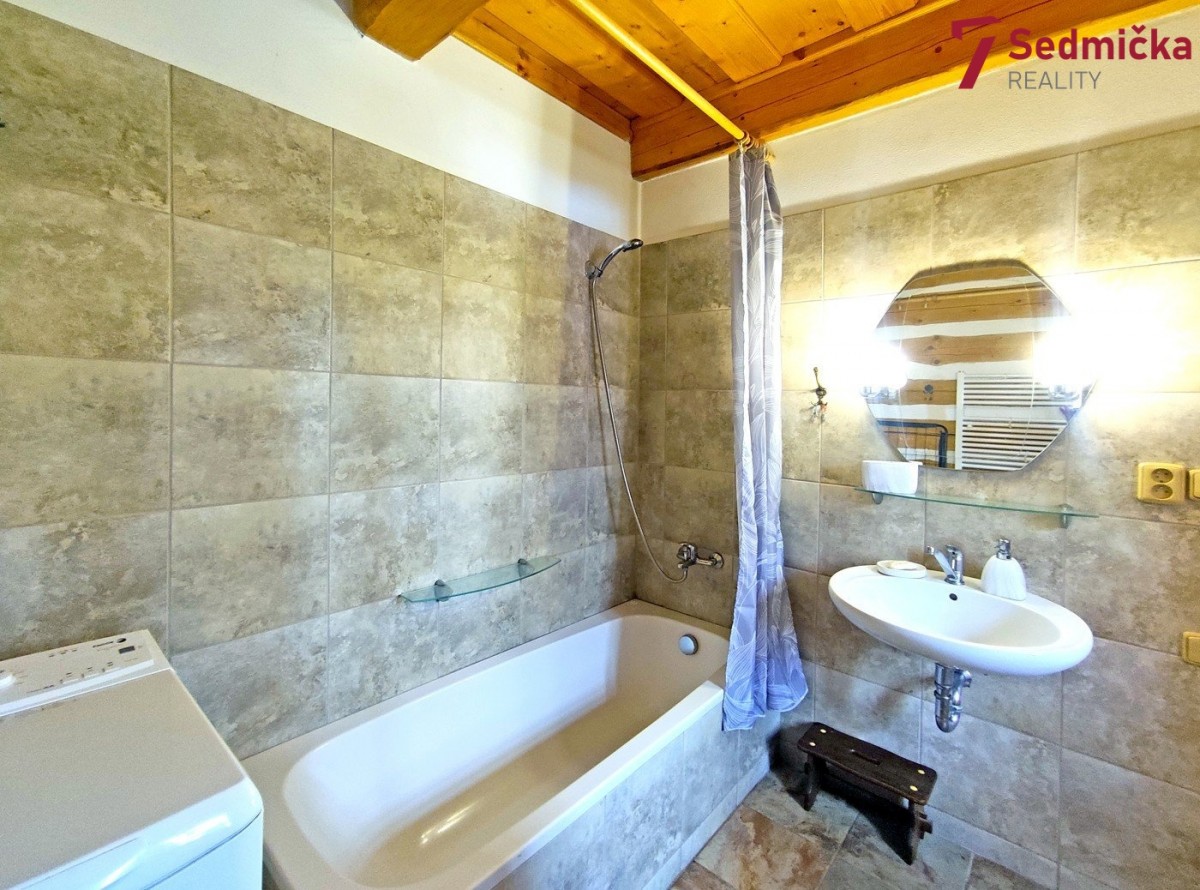 V přízemí se nachází zádveří  -  chodba,  kuchyňský kout s jídelnou,  obývací pokoj a koupelna s sociální zařízení WC.  V podkroví jsou dvě samostatné ložnice a technická místnost.  K domu přiléhá přístavba,  ve které je prostor pro dílnu,  který lze propojit s obytnou částí,  což by umožnilo vytvoření další obytné místnosti.  Na zastřešeném zápraží domu je menší posezení a v rohu vydlážděného dvorku venkovní krb.  Parkování je možné přímo u domu na vlastním pozemku.  Velmi příjemní nejbližší sousedé,  v obci je obecní úřad,  výčep,  penzion s restaurací,  hřiště a výletiště.