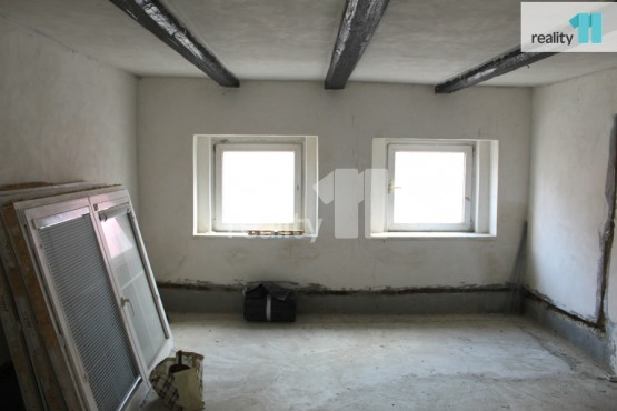 V prvním podlaží domu jsou tři místnosti včetně kuchyňského koutu a vstup do půdních rozlehlýc...h půdních prostor.