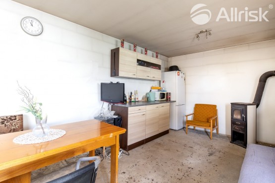 Spodní podlaží nabízí velký obývací pokoj s kuchyňským a jídelním koutem (36 m2) kde rodinnou atmosféru vytváří krb který lze zároveň použít k vytápění celého domu a vstupem na zahradu. Dále se v přízemí nachází druhý samostatný pokoj (13, 50 m2), koupelna s sociální zařízení WC (6 m2), chodba (6, 19 m2) a schodiště vedoucí do patra domu.