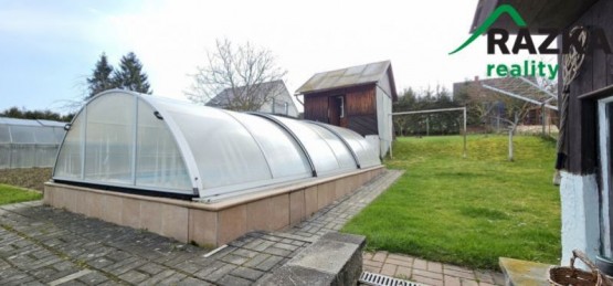 Na zahradě, která je oplocená a o výměře 640 m2, se nachází pergola, krytý bazén, skleník, dřevěná kůlna na nářadí a garáž.