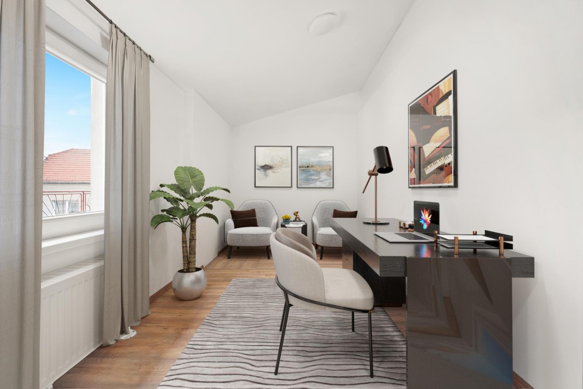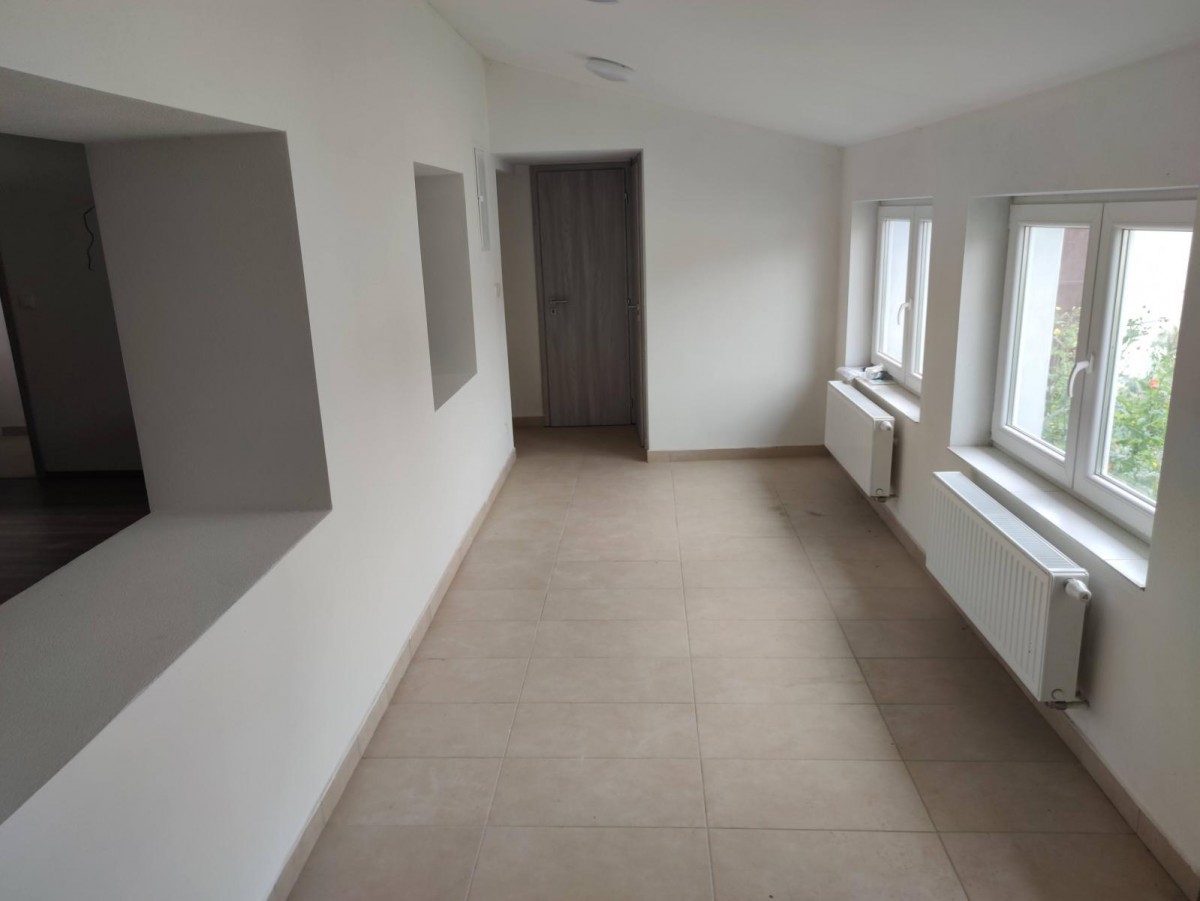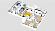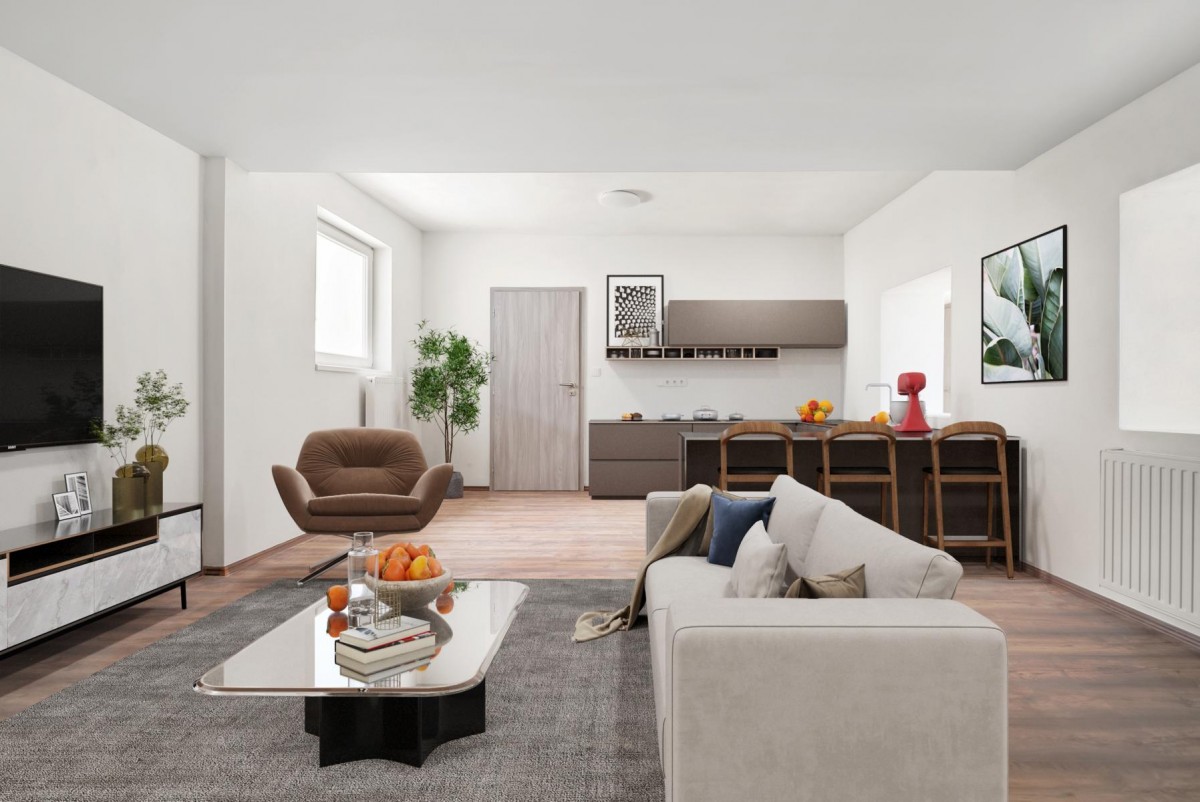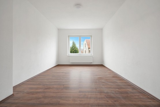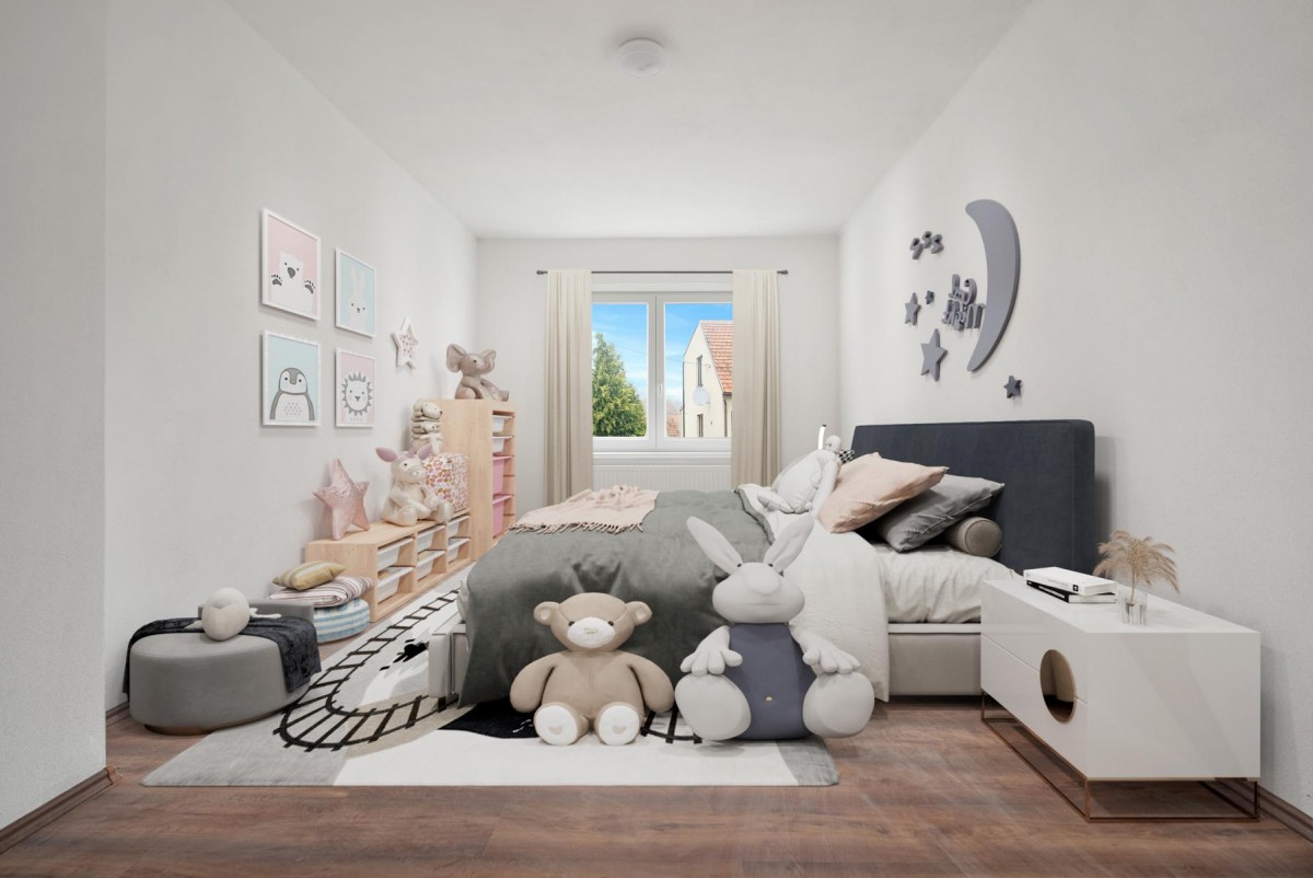 Dispozice : zádveří 13 m2, pokoje 19 m2, 17 m2 a 8 m2, obývací pokoj s kuchyní 27 m2, koupelna se sprchovým koutem 4, 6 m2, technická místnost 4 m2, sklep 8m2, samostatné sociální zařízení WC. Terasa přístupná z chodby má výměru 17 m2.