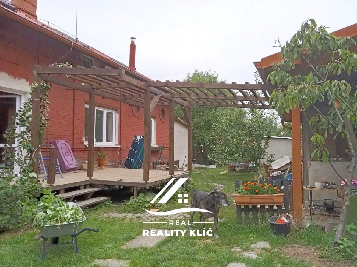 Předzahrádka se vzrostlou zelení, terasa s dřevěnou pergolou, ideální pro grilování, zděný zahradní domek a hospodářské stavby využitelné jako sklad či dílna.
