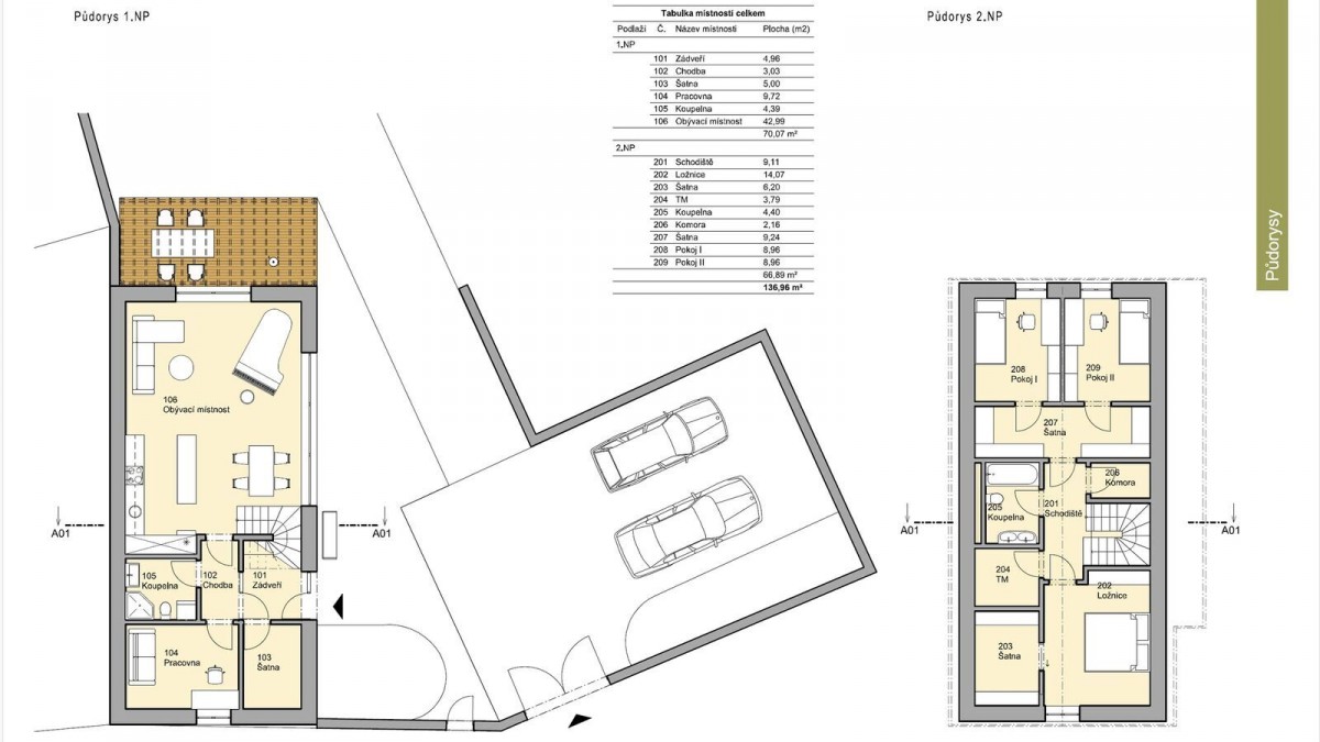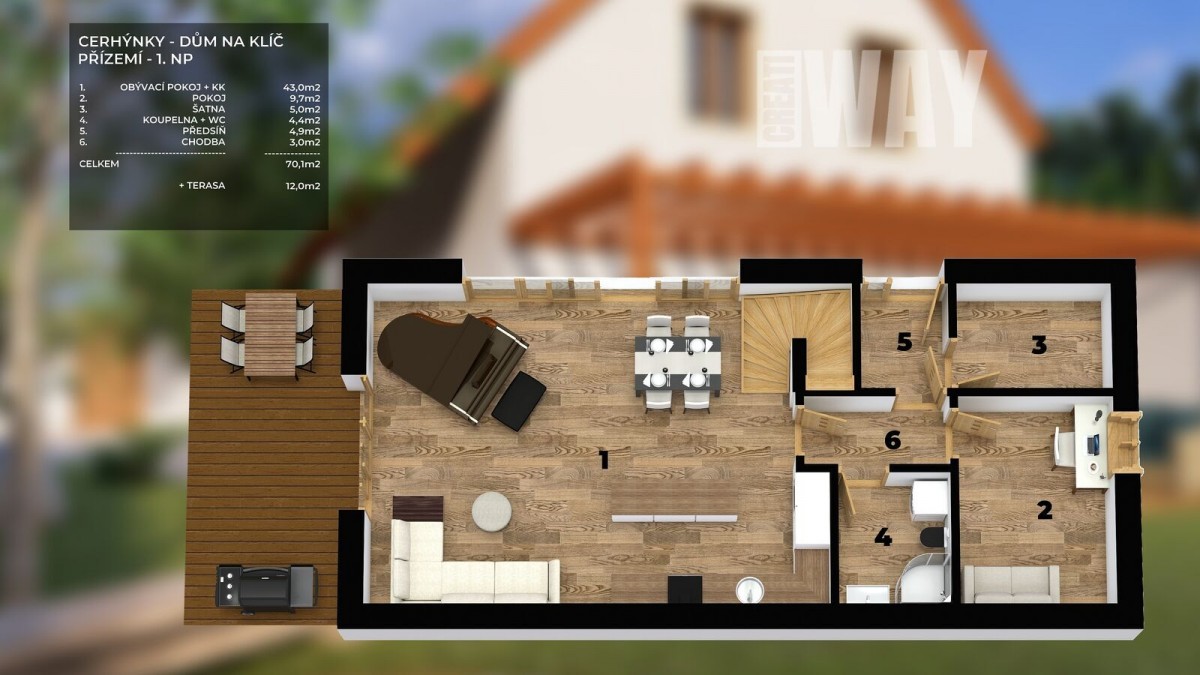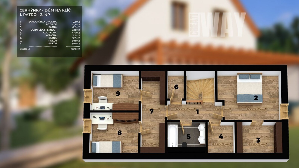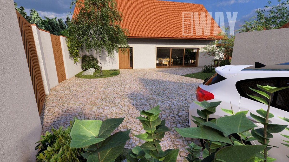Jedná se o stavbu se sedlovou střechou, otevřenou do zahrady a oddělenou od veřejné komunikace cihlovou zdí. Stavba samotná je dvoupodlažní, kdy v přízemí najdete velký obytný prostor o velikosti 43m2 s kuchyní a jídelním koutem, s přístupem na terasu skrz francouzské okno. Dále je v přízemí pracovna či pokoj, koupelna a šatna. Nahoře v patře naleznete tři ložnice se šatnami, koupelnu, komoru a technickou místnost.